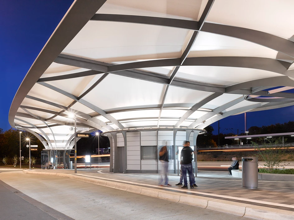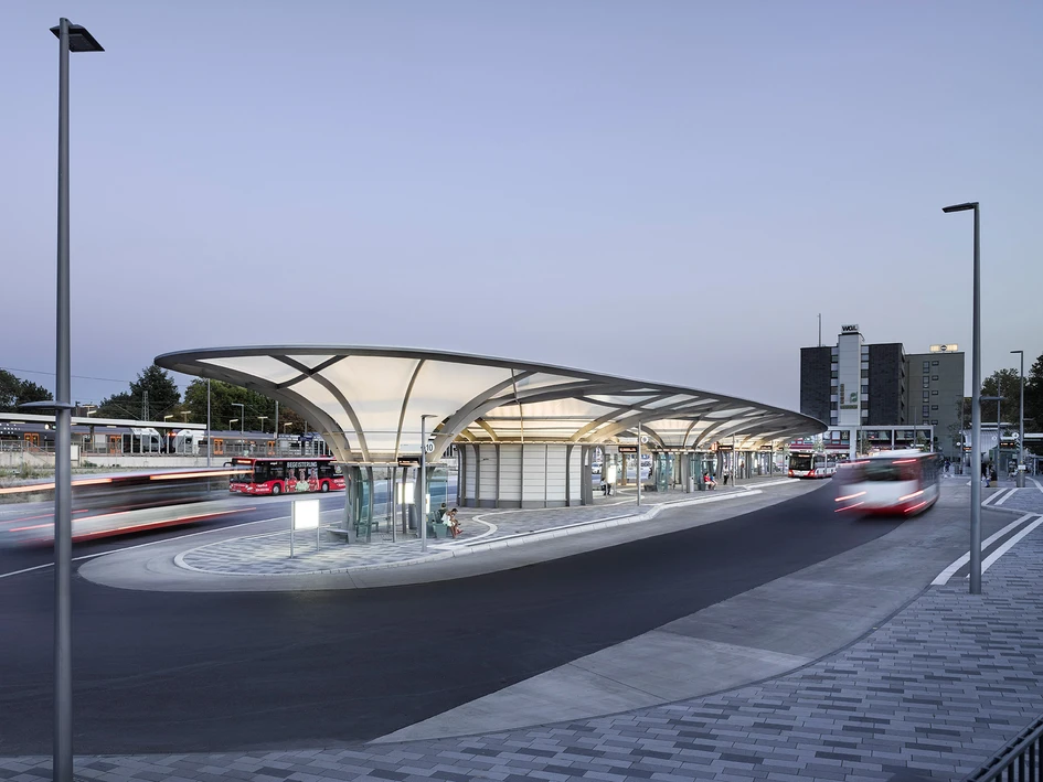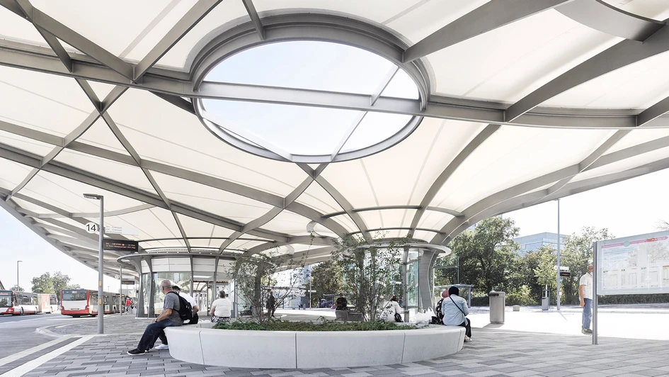 Die Überdachung des Busbahnhofes in Leverkusen-Wiesdorf besteht aus einer Stahl-Membrankonstruktion. Die extrem filigranen und unregelmäßig angeordneten Stahlträger werden mittels eines hochfesten Membrangewebes überspannt. Durch die hohe Transluzenz ergibt sich trotz der großen überdachten Fläche darunter ein äußert freundliches Klima. Damit lädt das an sich funktionale Gebäude zum Verweilen ein. Die qualitativ hochwertige Membrane ist dank ihres hochfesten Polyester-Gewebes äußerst robust und witterungsbeständig. Die acht einzelnen Membranelemente wurden erst bei der Montage zu einer zusammenhängenden und wasserdichten Oberfläche verschweißt. Insgesamt erstreckt sich die Überdachung bei einer Länge von 120 Metern und einer Breite von 24 Metern auf eine Gesamtfläche von über 2.000 m².