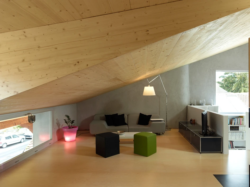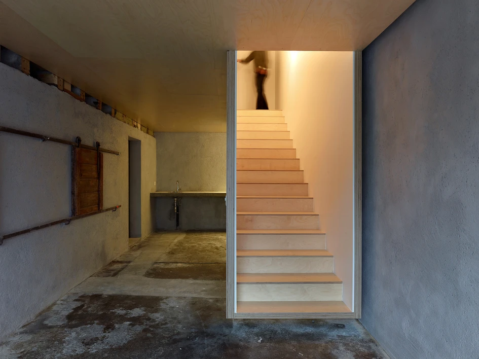 Die Materialität des Bauernhofes wird beibehalten. Sie setzt sich aus dicken, unregelmäßigen, rau verputzten Mauern und einem großen Dach zusammen, dessen Innenseite mit rau belassenem Tannenholz verkleidet wurde. Die Materialität des "Gegenstandes" hingegen wird anders behandelt, nämlich als ein glatt und präzise verarbeiteter Koffer aus Holz.