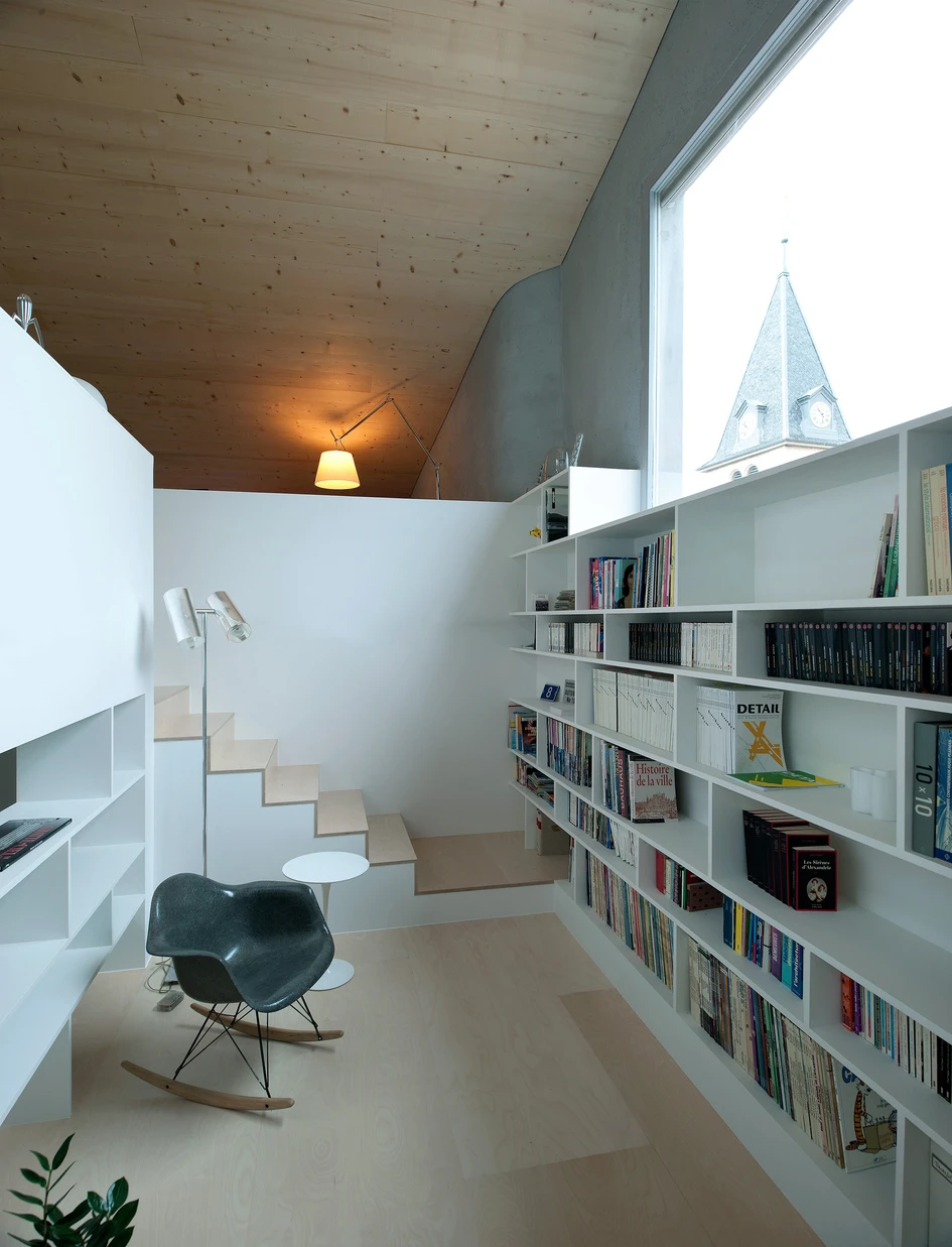 Ein zweites Appartement entsteht in der Scheune. Es gliedert sich als ein Objekt in diesem großen Volumen ein. Von Aussen ist es durch die großen, bereits existierenden Öffnungen sichtbar. Man nimmt dieses Objekt bereits am Anfang des Parcours wahr. Geht man darunter hindurch, findet man eine sich auffächernde Treppe, die zum Eingang des Appartements führt. Die Zimmer sind in der Masse angesiedelt, die an der Stelle der Bibliothek wie herausgeschnitten erscheint. Im Vorübergehen dieses Raumes gelangt man zum Gipfel des Objekts, wo man, versammelt unter dem Dach der Scheune, den Salon und das Esszimmer vorfindet. Die Küche und der Schornstein sind Volumen, die als Wucherungen des Gegenstands behandelt wurden.