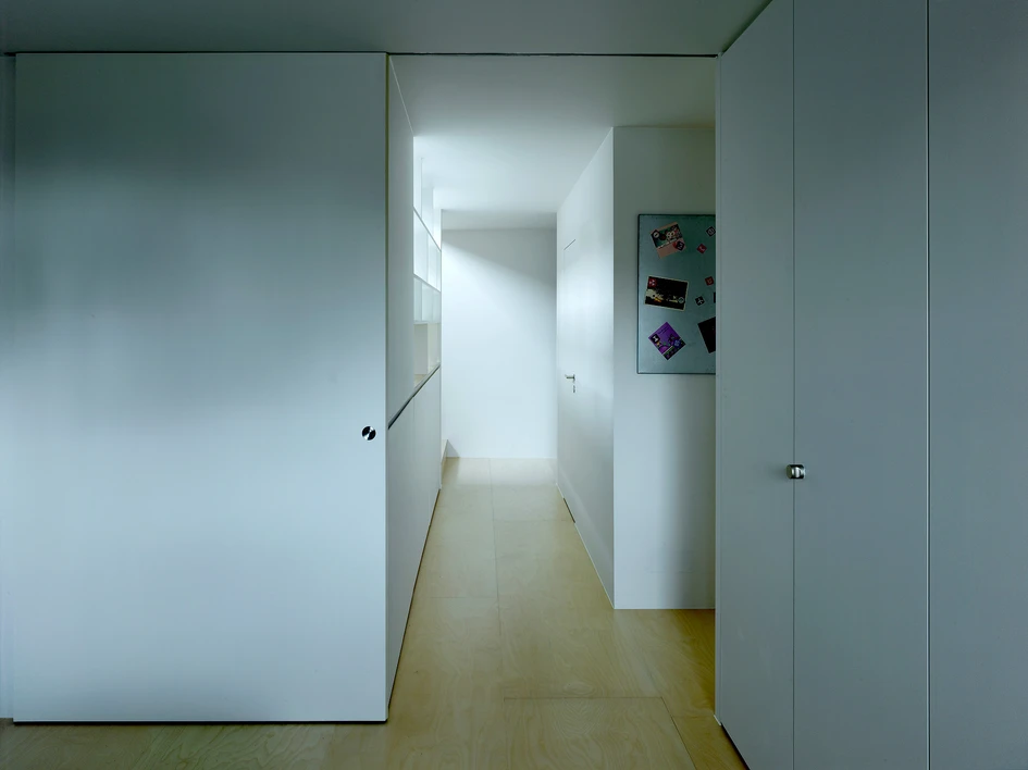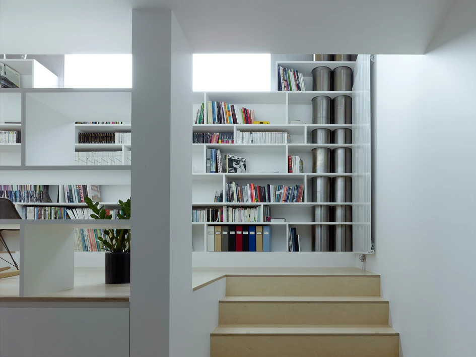 Die alte Wohnung wird einfach umgebaut: Der Salon, die Küche und das Esszimmer siedeln sich im an den Garten angrenzenden Erdgeschoss an. Die Zimmer befinden sich in den oberen Stockwerken. Ein neuer vertikaler Schacht versorgt diese Räume der drei Niveaus des Gebäudes. Dieser Schacht wird als ein Möbel behandelt, das die Treppen, die Schränke und ein Badezimmer enthält.