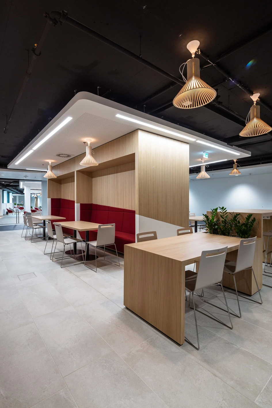 Selbstverantwortung, Flexibilität und Vertrauen – das sind die Attribute, die die innovative Office-Landschaft der Unicredit Bank Austria zum Ausdruck bringt. Die Innenarchitektur und die Produktwahl mit Holzoberflächen stehen hiermit im Einklang. Die angenehme Atmosphäre zieht sich durch die verschiedenen Arbeitsumgebungen bis in den Pausenbereich.