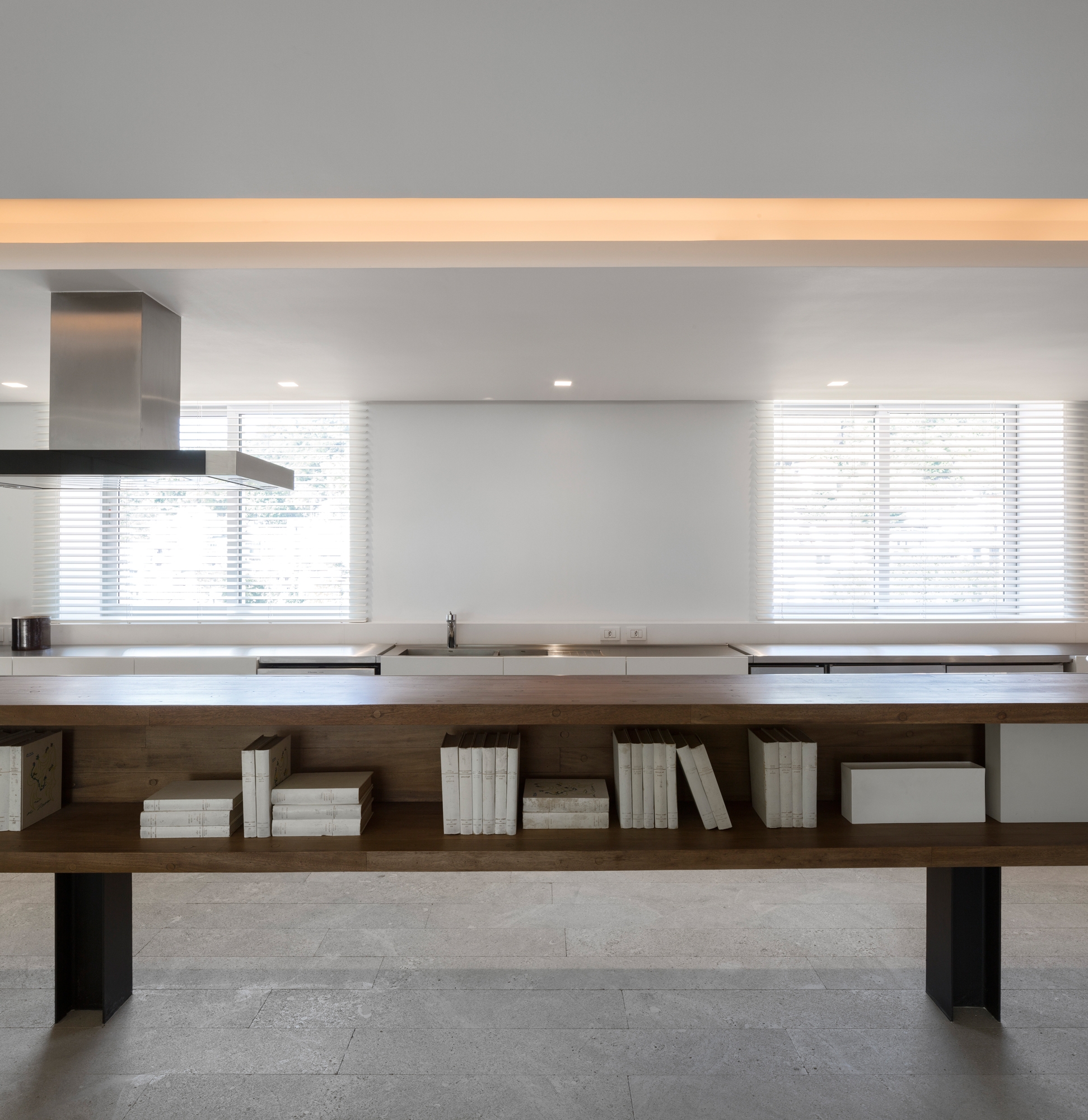 The duplex underwent a complex legal approval process for building a third floor. It was imperative to do so in order to reorganize the program in three layers, through an original solution where the access is made via the now intermediate floor. An extensive engineering work reinforced the structure to gain maximum openings and integrate the spaces both within the apartment and towards the landscape. No element incorporates this idea better than the stairs that connect the three floors underneath a generous skylight, illuminating the core of the apartment thanks to the new structure, expressed by modernist cylindrical columns.