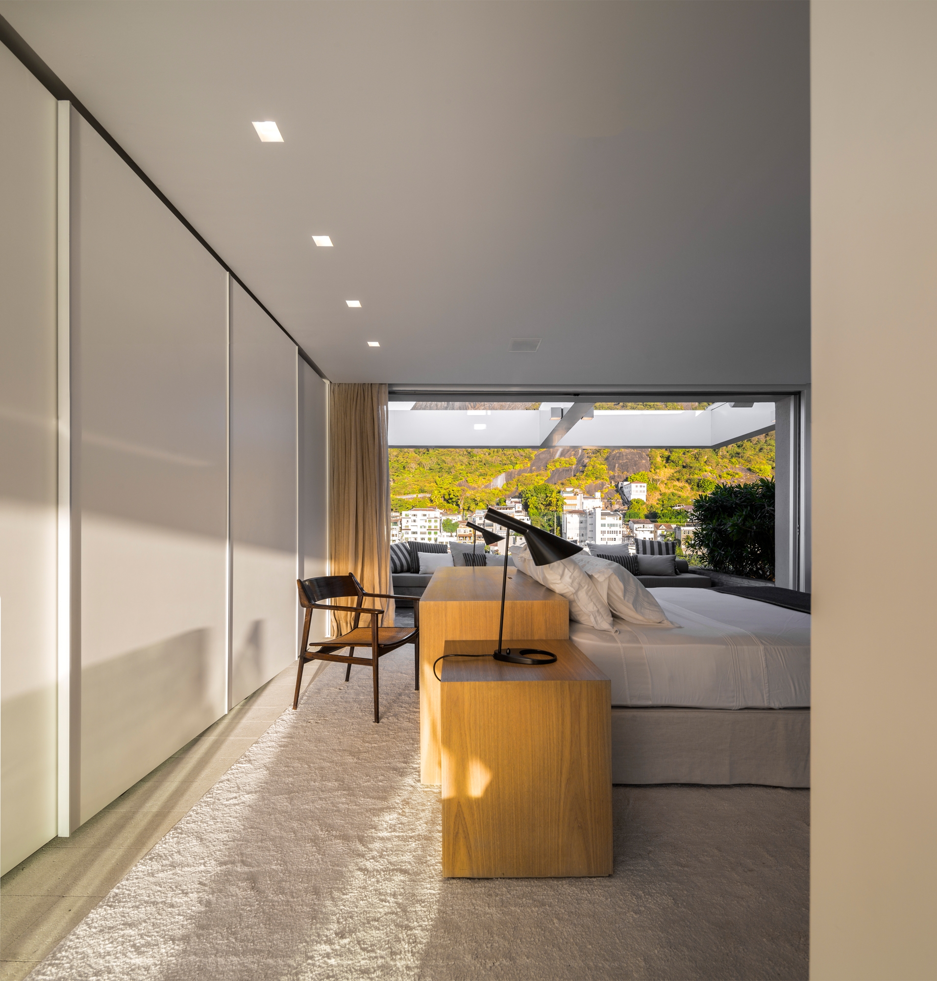 The intermediate floor, from which the access is made, was transformed into one large open space, integrating the kitchen to the living room and the terrace. Sliding doors run to the side and remove any obstacles between Guanabara Bay and the layouts oriented towards the view, such as the working desk that invites for contemplative pauses. Above the living room, three skylights render this space even more luminous with its flooring made out of limestone sliced in a narrow pattern.