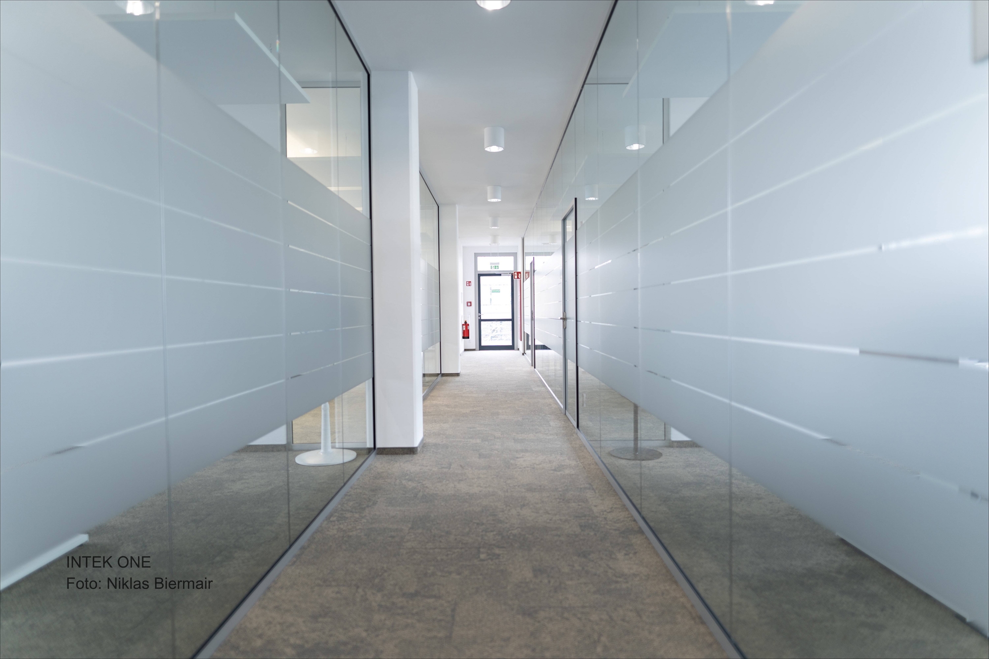 Die Alu - Glaswandkonstruktion ist zur Aufnahme eines einteiligen Blockrahmenprofils, Oberfläche ist Alu natur EV1-1 bzw. pulverbeschichtet Farbe anthrazit grey vorgerichtet. In diesem Blockrahmenprofil können sowohl Ganzglastürblätter (8 oder 10 mm stark) als auch Holztürblätter (40 mm stark) integriert werden. Zur Aufnahme von Schalter und Steckdosen dient der eigens dafür konstruierte Kabelkanal / bzw. Bandrasterelement. Der Kabelkanal besteht aus einem 2-teiligen Aluminiumprofil Oberfläche ist Alu natur EV1-1 bzw. pulverbeschichtet Farbe anthrazit grey. Der Kabelkanal ist zu Revisionszwecken mit einem Deckel mit Klemmverschlüssen versehen. Die leichte Entfernung des Deckels dient zur nachträglichen Anbringung von Installationen auch durch produktfremde Personen.