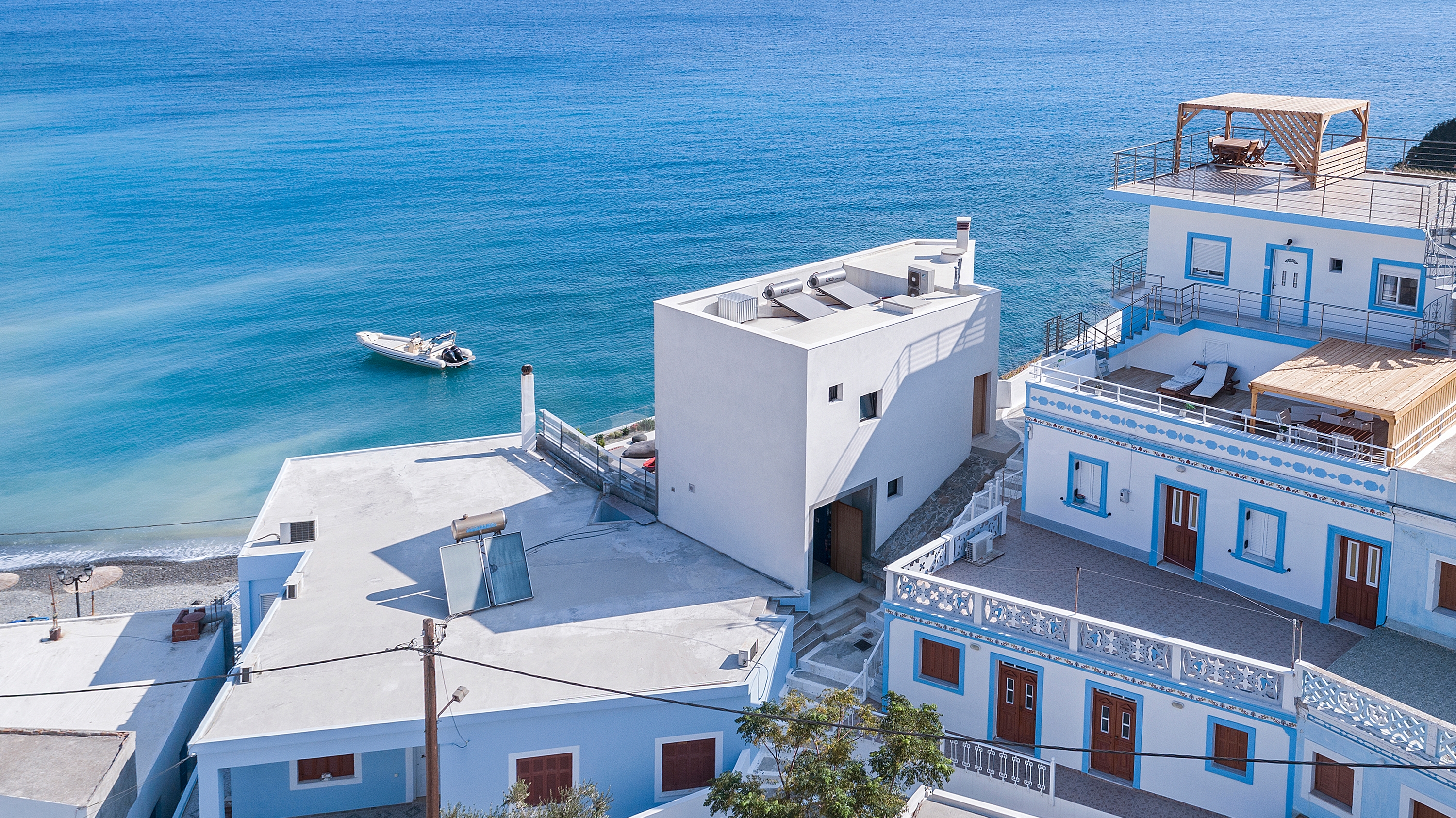 The island of Karpathos is known for its beautiful staggered villages with their shared roofs and balconies. The site for this project – in the picturesque village of Diafani – is no different. The lot itself is partially situated on the rooftop of an existing building. This rooftop offers an incredible 180 degree vista with views of the port of Diafani to the east, the Aegean Sea to the north, and the settlement of Diafani to the west. A primary design goal was to maintain the outdoor rooftop feeling of the site while creating a house on it. The site is transformed into a private viewing point, a veranda, embraced by a perimetrical wall, offering maximum privacy and protection from the winds. An enclosed volume suspended above the veranda, designed with references to the vernacular architecture of the island, provides shade for the rooftop and hosts all of the house’s private spaces. The house’s social functions are in an open plan on the veranda, a summer room that has an undefined indoor/ outdoor character thanks to the 13.8m opening with only structural support the perimetrical walls. The views and the proximity to the sea, as well as the location in the vernacular settlement, are the most important features of the house, and the interior is designed to accentuate and enrich this experience. A collage of colours and materials as well as the play with heights and shapes in all the rooms anchor the house in its surroundings and maximise the potential of the otherwise small rooms.