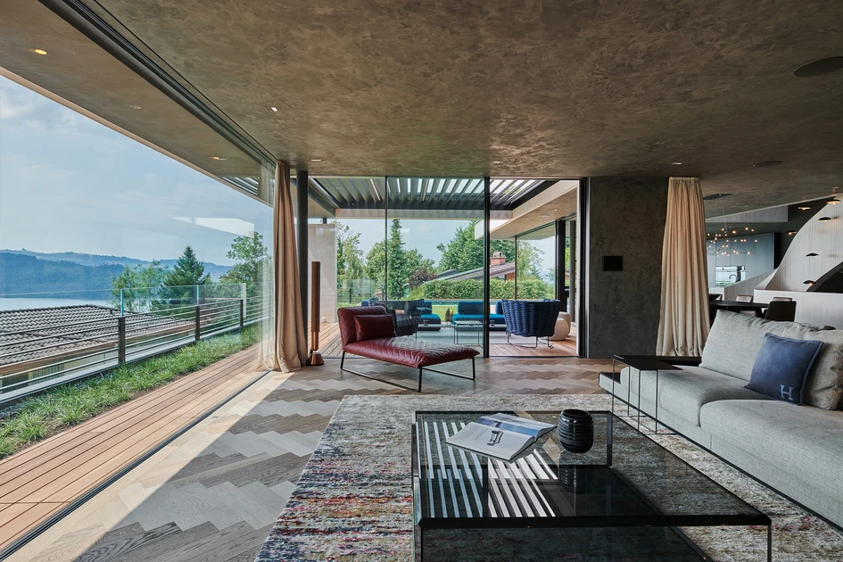 Die offene Raumgestaltung schafft eine luftige und lichtdurchflutete Atmosphäre, die die Grenzen zwischen Innen- und Aussenbereich verschwimmen lässt. Dank der rahmenlosen Schiebefenster wird dieser nahtlose Übergang betont und verstärkt. Die grossflächigen Verglasungen von swissFineLine laden die Natur in den Innenraum ein und bieten einen ungehinderten Blick auf den Zugersee und die Rigi. Besonders eindrucksvoll wirkt die Ecköffnung in der Küche. Die beweglichen Fensterflügel erweitern den Lebensraum und sorgen für ein grenzenloses Freiheitsgefühl.