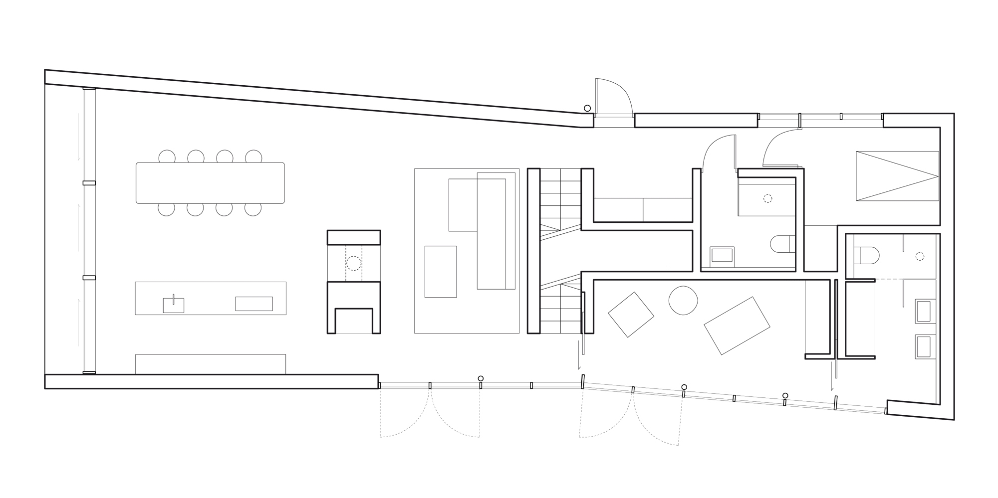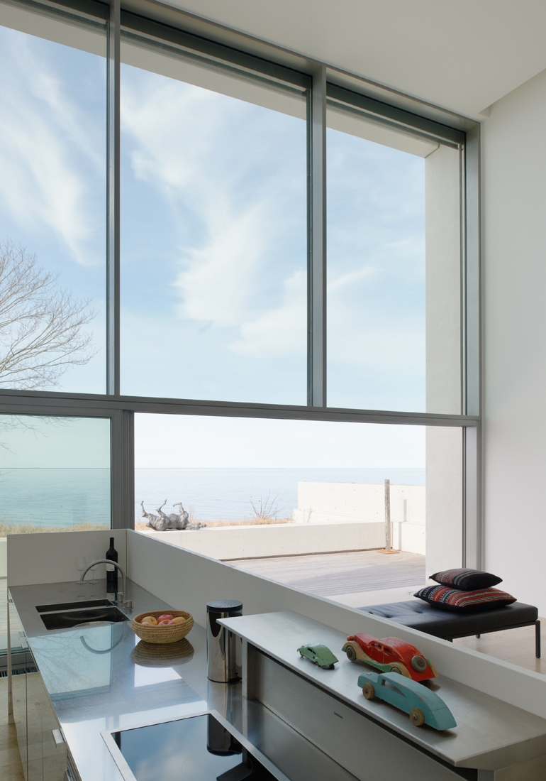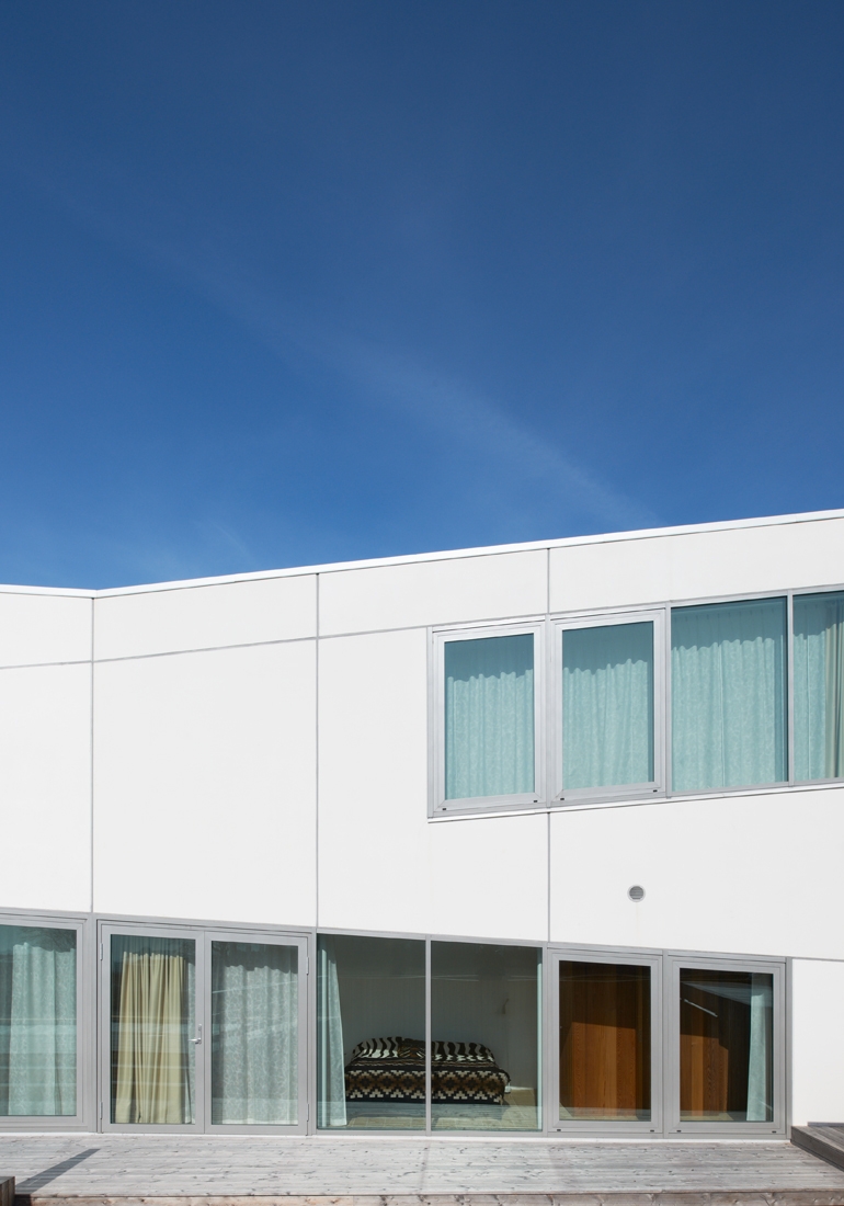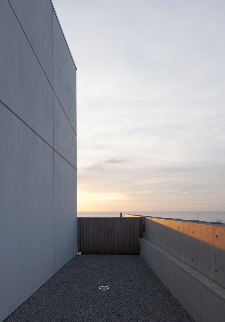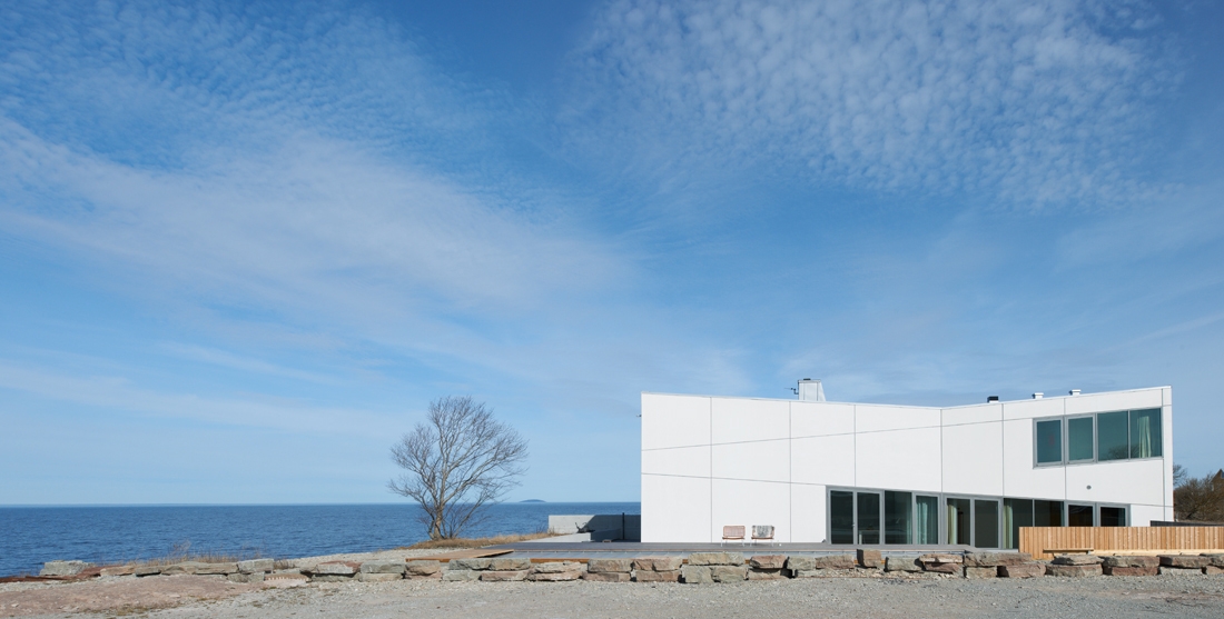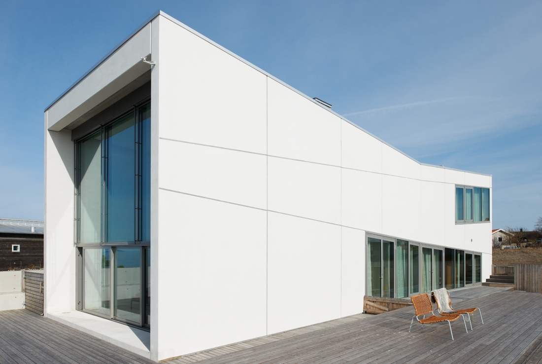This house is like a funnel of light, space and sea views. The location is the west coast of the Baltic island of Öland. The white concrete box is "corsetted" in the middle, creating slightly sheared wall and roof angles. This gives the house both its direction and character, while also marking the difference between the rear private two-storey bedroom part and the communal double ceiling-height front part.