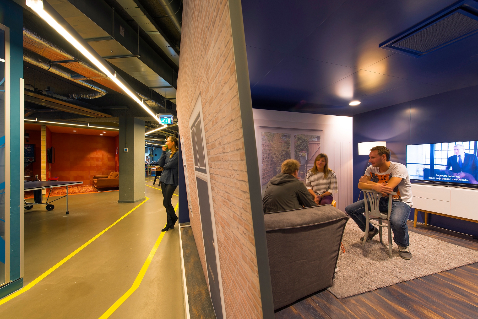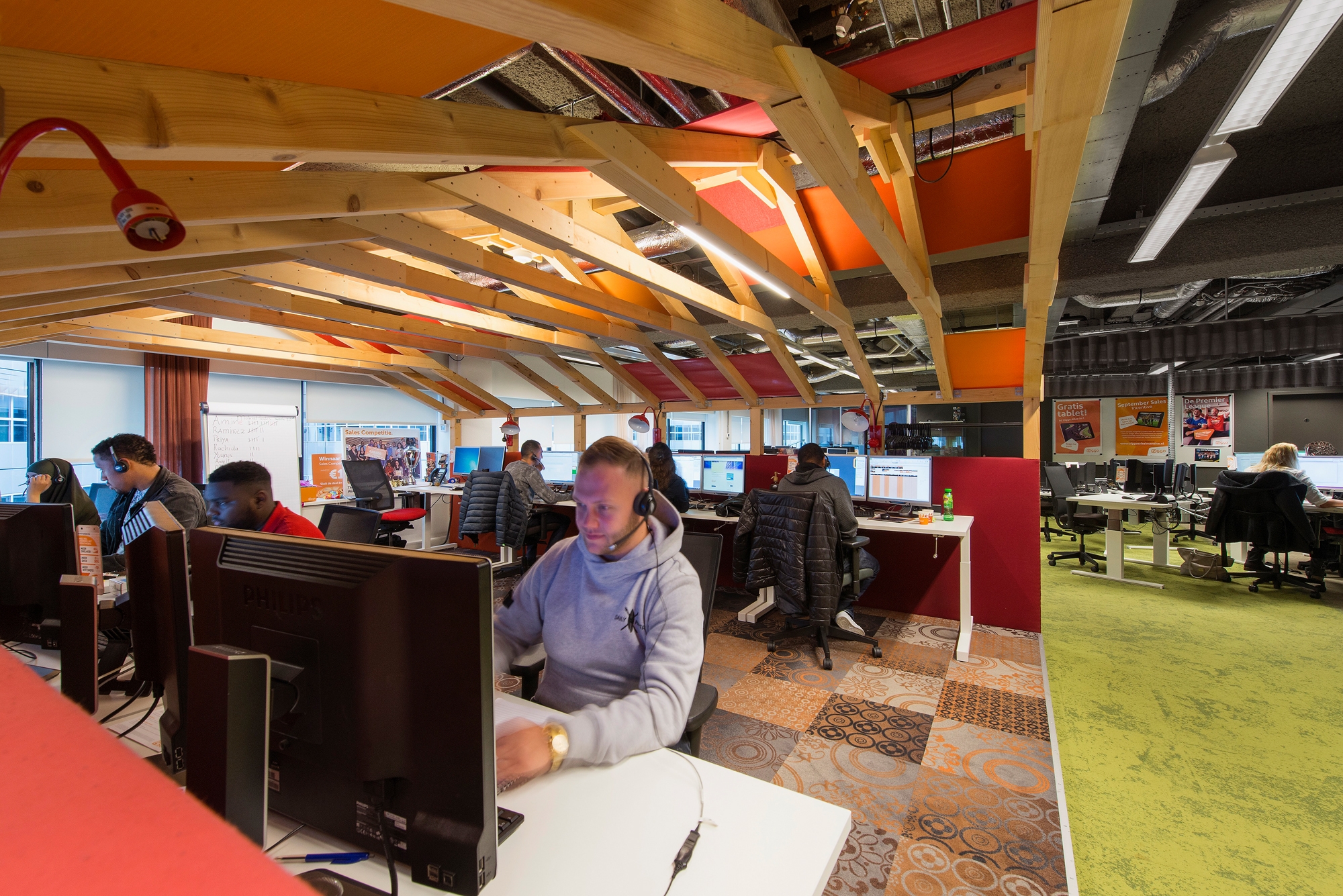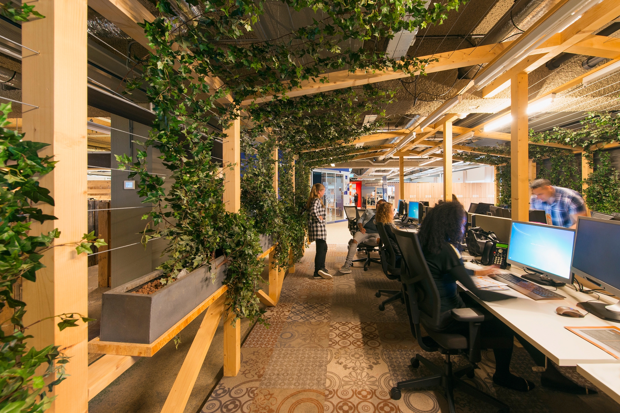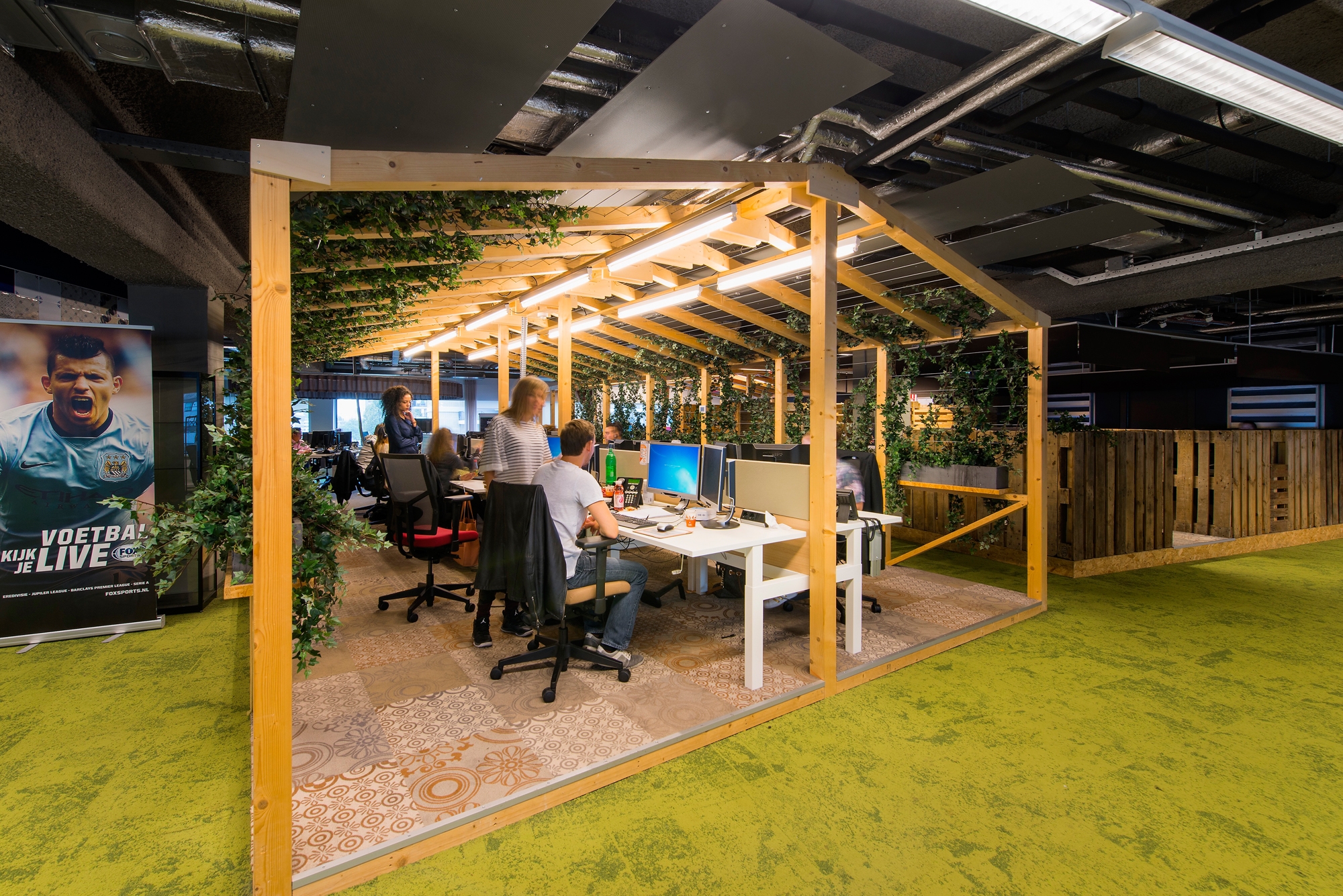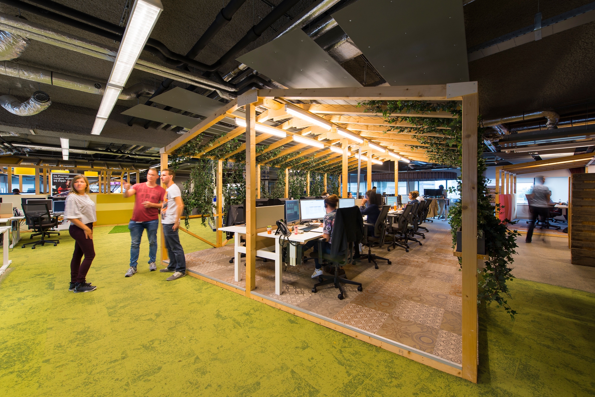 Das Call-Center von Ziggo umfasst mehrere große, offene Bereiche, die Evolution Design in kleinere Arbeitsbereiche umwandelte. Dabei wurden kostengünstige Lösungen wie einfache Holzrahmen, Akustikpaneele oder unterschiedliche Bodenbeläge zur Abgrenzung der Bereiche verwendet. Die Mitarbeiter haben bei der Arbeit nun die Wahl zwischen so unterschiedlichen Bereichen wie ein mit Pflanzen begrüntes „Gewächshaus“, offenen Räumen mit hellgelben Akzenten und bunten Bodenfliesen oder einer urbanen Zone, in der aufgearbeitete Holzpaletten zum Unterteilen und Dekorieren eingesetzt wurden.