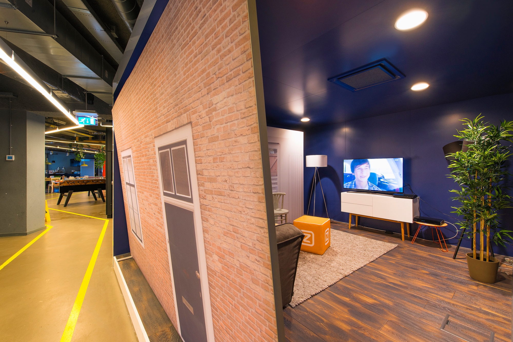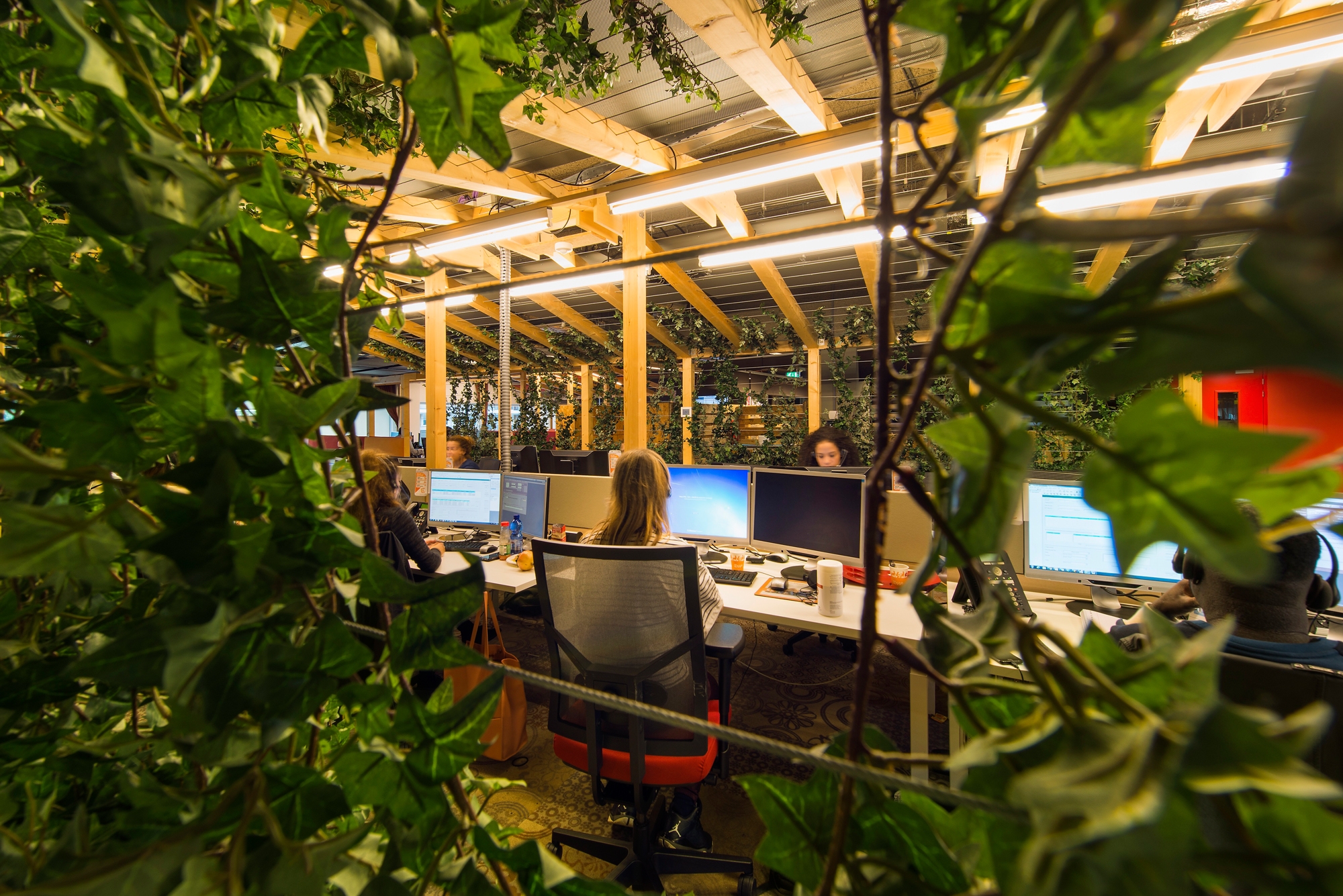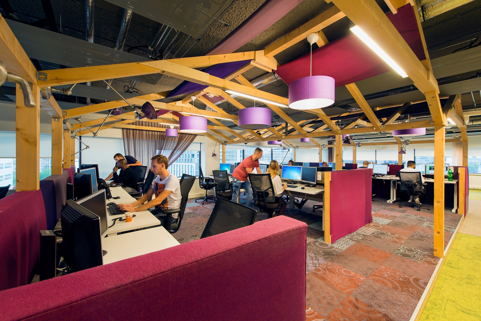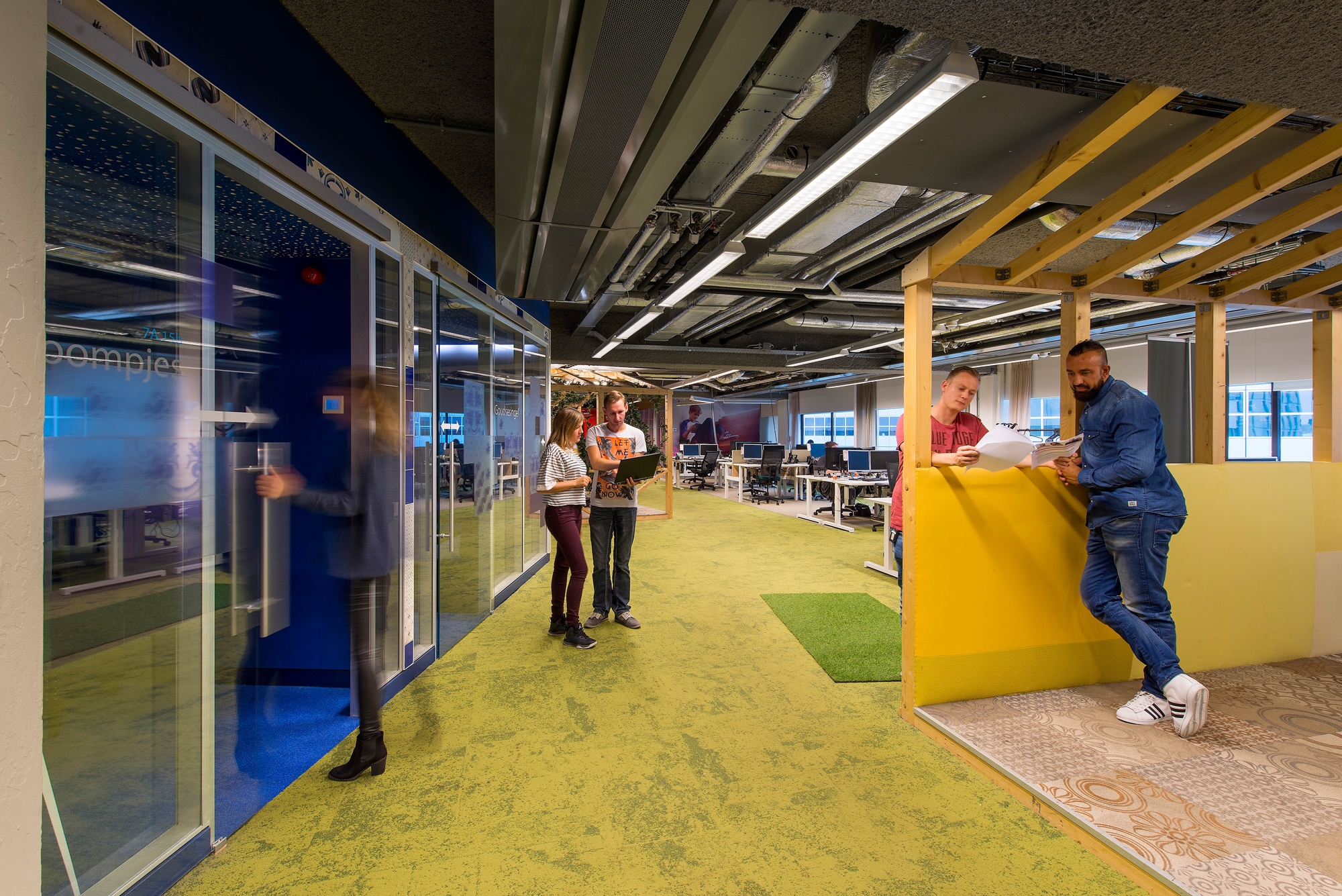 Das Call-Center von Ziggo umfasst mehrere große, offene Bereiche, die Evolution Design in kleinere Arbeitsbereiche umwandelte. Dabei wurden kostengünstige Lösungen wie einfache Holzrahmen, Akustikpaneele oder unterschiedliche Bodenbeläge zur Abgrenzung der Bereiche verwendet. Die Mitarbeiter haben bei der Arbeit nun die Wahl zwischen so unterschiedlichen Bereichen wie ein mit Pflanzen begrüntes „Gewächshaus“, offenen Räumen mit hellgelben Akzenten und bunten Bodenfliesen oder einer urbanen Zone, in der aufgearbeitete Holzpaletten zum Unterteilen und Dekorieren eingesetzt wurden.