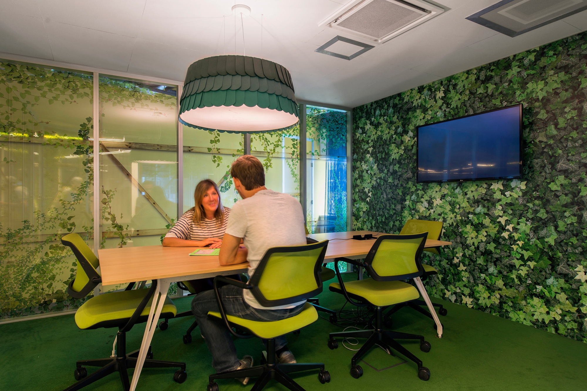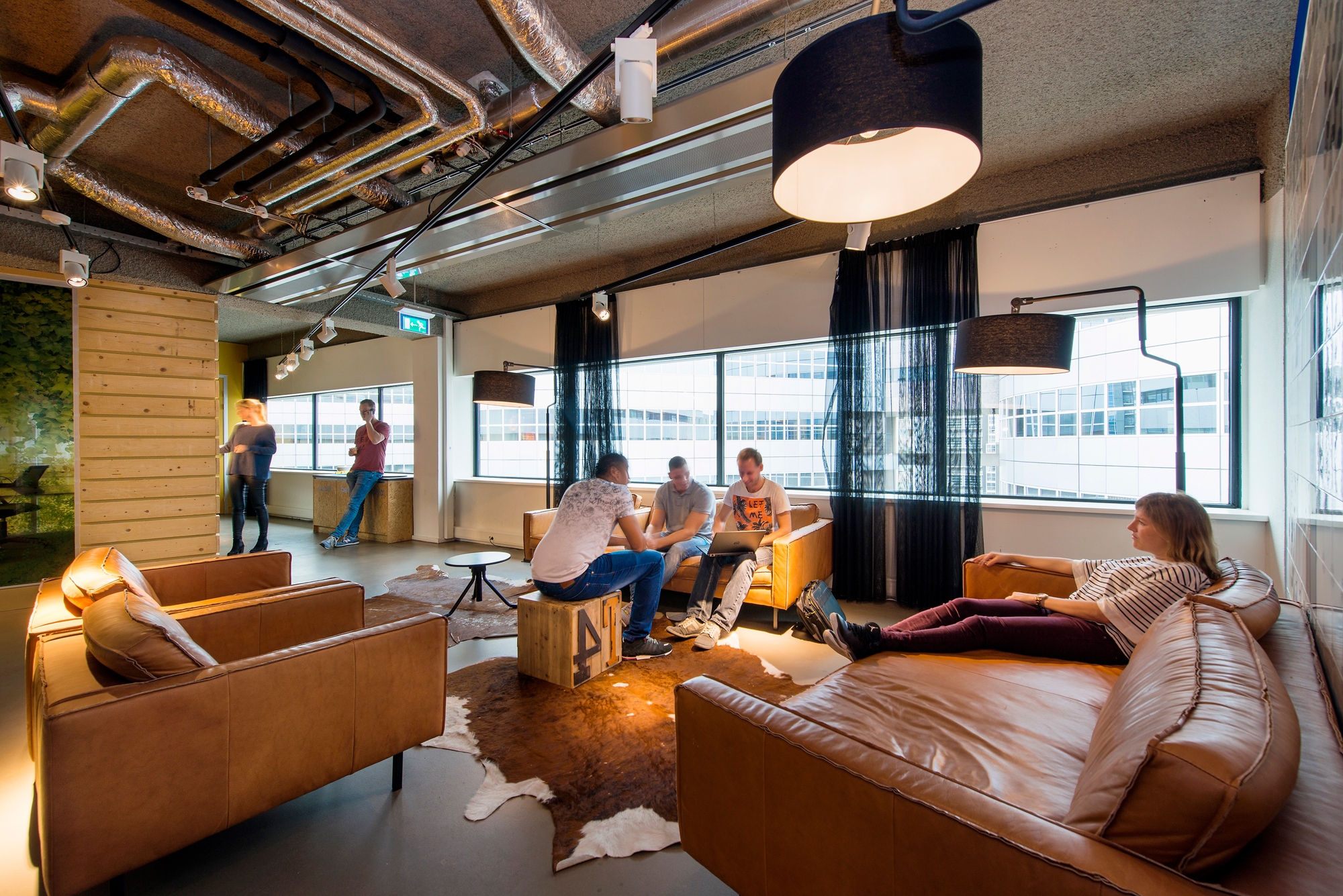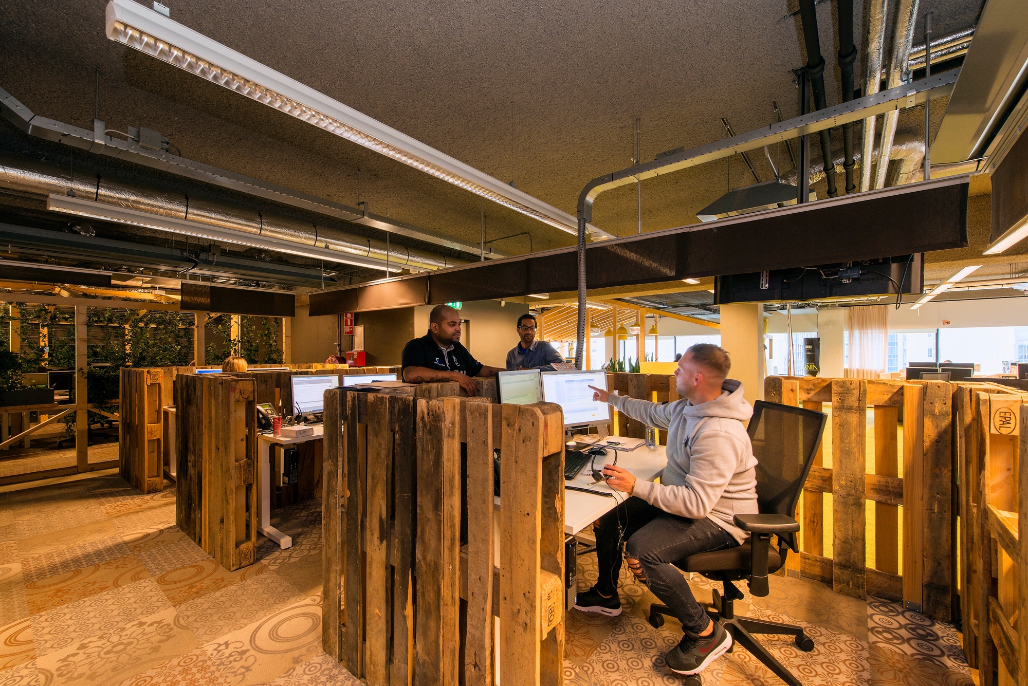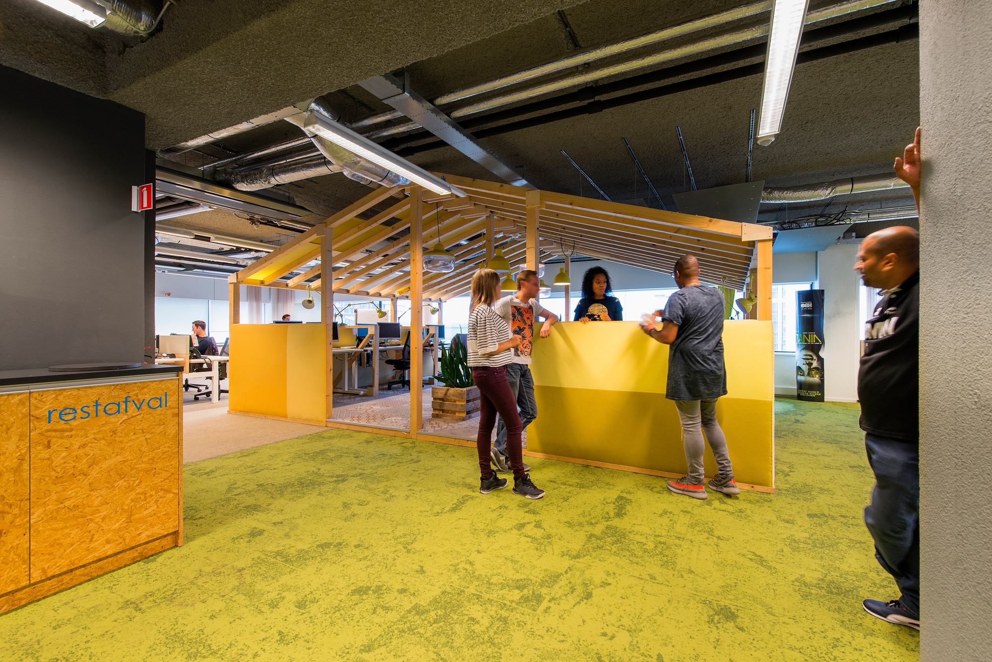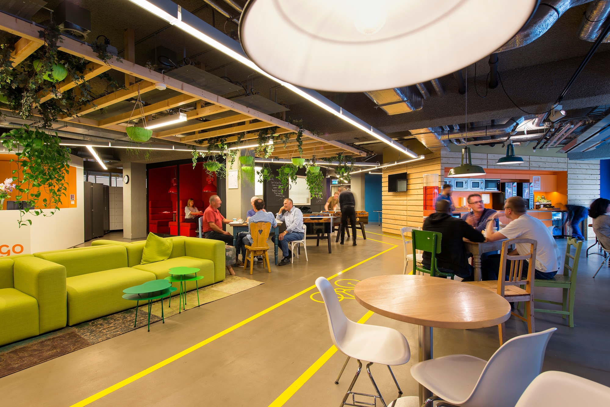 Das Call-Center von Ziggo umfasst mehrere große, offene Bereiche, die Evolution Design in kleinere Arbeitsbereiche umwandelte. Dabei wurden kostengünstige Lösungen wie einfache Holzrahmen, Akustikpaneele oder unterschiedliche Bodenbeläge zur Abgrenzung der Bereiche verwendet. Die Mitarbeiter haben bei der Arbeit nun die Wahl zwischen so unterschiedlichen Bereichen wie ein mit Pflanzen begrüntes „Gewächshaus“, offenen Räumen mit hellgelben Akzenten und bunten Bodenfliesen oder einer urbanen Zone, in der aufgearbeitete Holzpaletten zum Unterteilen und Dekorieren eingesetzt wurden.