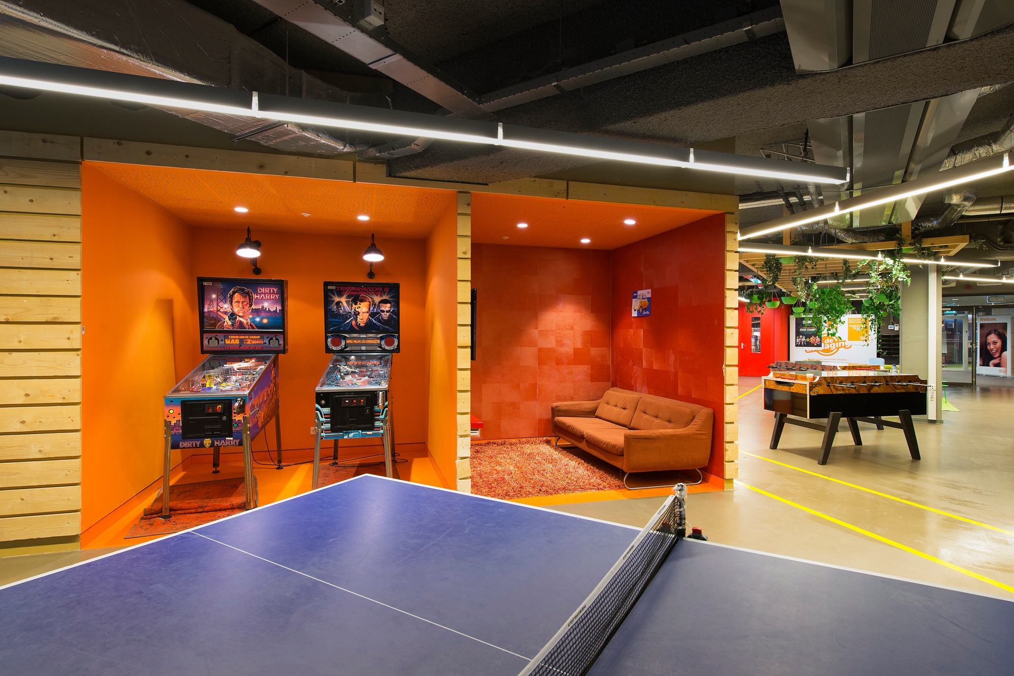 Das Design von Evolution Design umfasst außerdem einen zentralen Rezeptionsbereich mit Meeting- und Schulungsräumen sowie einen farbenfrohen Begegnungsraum zum Entspannen mit bequemen Sofas, einem Café und einer Spielzone mit Tischfußball und Videospielen. „Wir wollten ein Zusammengehörigkeitsgefühl schaffen, indem wir Orte anbieten, an denen sich die Mitarbeiter treffen, erholen und Energie tanken können“, sagt Stefan Camenzind.