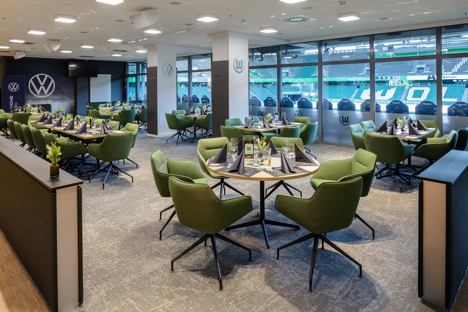 Die Auswahl der Möbel in den Vereinsfarben des VfL Wolfsburg verleiht den Räumlichkeiten eine besondere Note und unterstreicht die Identität des Clubs. Die markante grüne Farbgebung der Möbelstücke, wie die wendigen halm Stapelstühle, banc Sitzbänke und ray soft Polstersessel, hebt sich eindrucksvoll ab und trägt zur einzigartigen Atmosphäre bei. Diese Farben verstärken nicht nur die visuelle Präsenz der Möbel, sondern schaffen auch ein stimmiges und unverwechselbares Ambiente. Ergänzt durch die eleganten break Bistrotische und die komfortablen crona light Barhocker an den fina club Stehtischen wird die Leidenschaft des VfL Wolfsburg in jedem Detail spürbar, wodurch sich die Gäste in einem stilvollen und engagierten Umfeld rundum wohlfühlen können.