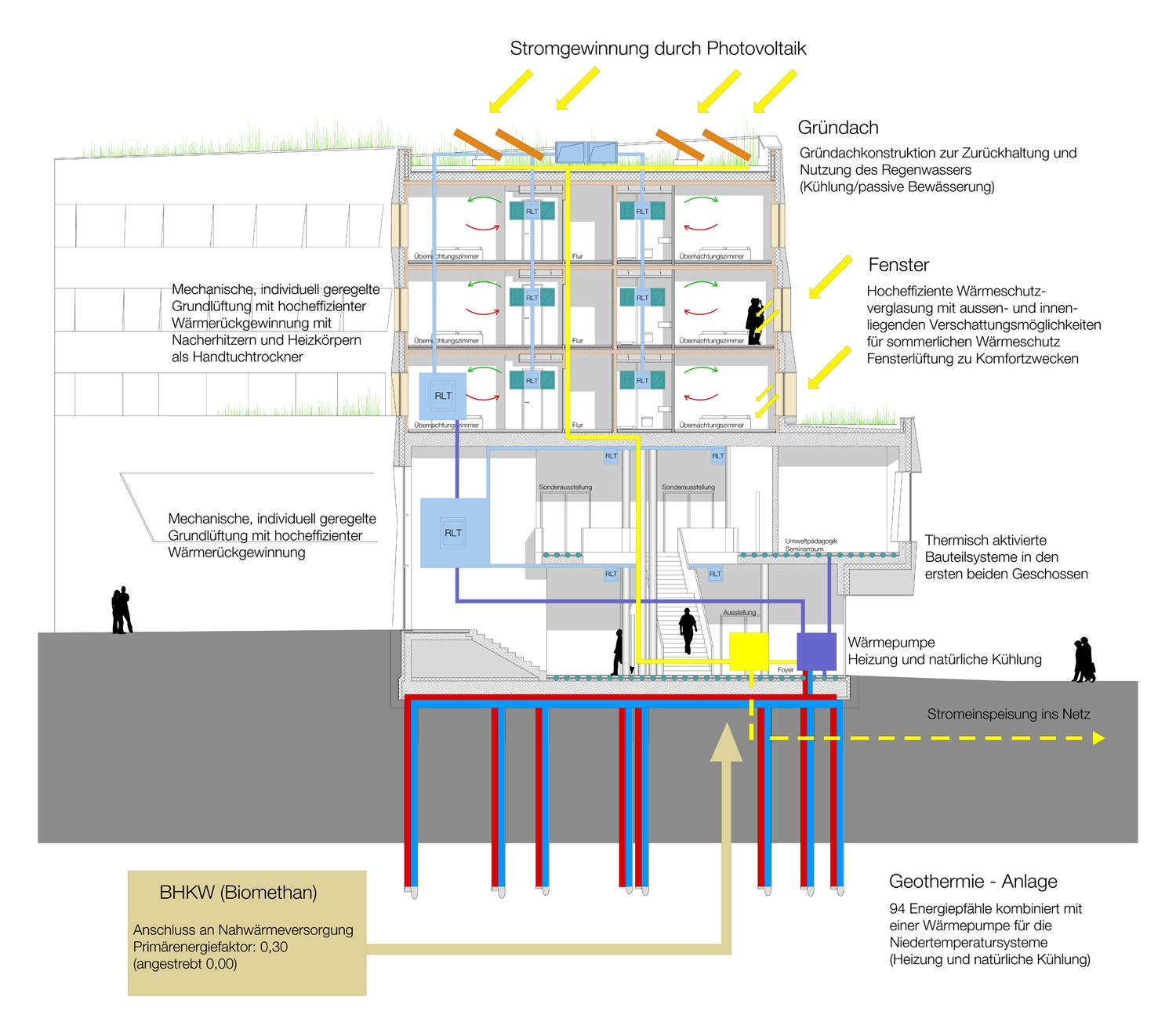 Die Isolierung der 20cm dicken Steinwolldämmung in den Außenwänden, die dichte Dämmung der begrünten Dachfläche und die dreifache Sonnenverglasung der Fensterscheiben ermöglicht die Reduzierung des Energieverbrauchs. Der geringe Energieverbrauch macht es möglich, dass das WÄLDERHAUS seinen Energiebedarf in weiten Teilen aus eigenen Quellen decken kann: über eine Photovoltaikanlage auf dem Dach und mithilfe von Geothermie, der Ausnutzung natürlicher Erdwärme (94 Energiepfähle in Verbindung mit einer Wärmepumpe). Das WÄLDERHAUS ist außerdem an ein Nahwärmenetz (Biomethan-BHKW mit Primärfaktor 0,30) angeschlossen. Der Hotelbereich in den oberen drei Geschossen des WÄLDERHAUSES erreicht Passivhausstandard.