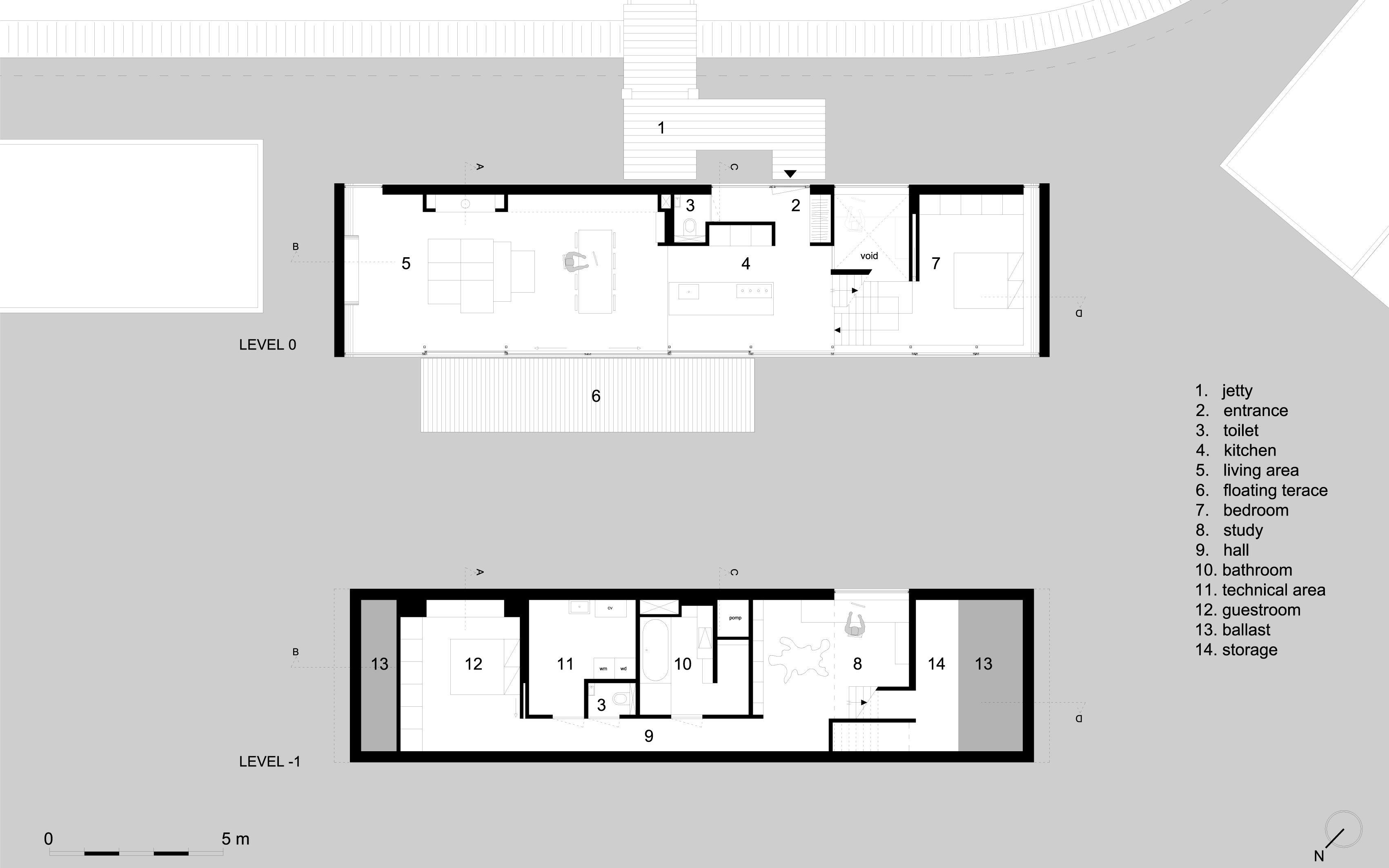The living area and open kitchen are located on the waterfront, from here one has a panoramic view at the Amstel and you can enter the floating terrace. Following on from the living area and kitchen the bedroom is located on a split level. The split level introduces an open route to the ground floor of the boat and, at the same time, makes it possible to create a terrace on the south side without exceeding the maximum building height.