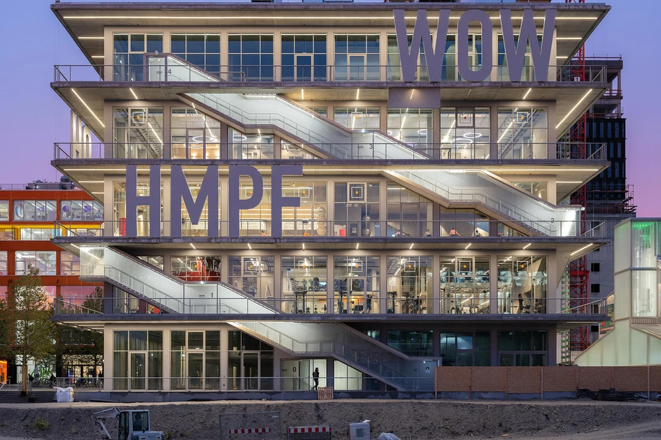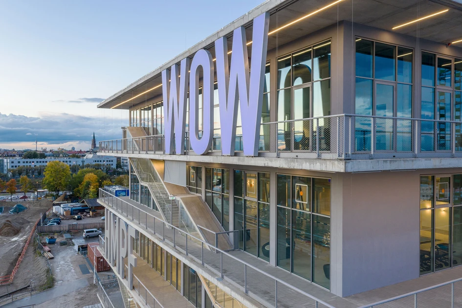 Mit dem Werk 12 bereichern die niederländischen Architekten MVRDV das Münchner Werksviertel um ein spektakuläres Gebäude, das den sprichwörtlichen „Wow“-Effekt auf seiner Seite hat. Dafür, dass es bei Dunkelheit noch etwas spektakulärer wirkt, sorgt die VISS Fassade des fünfstöckigen Baus, vor der lautmalerische Ausrufe in allen Neonfarben leuchten.