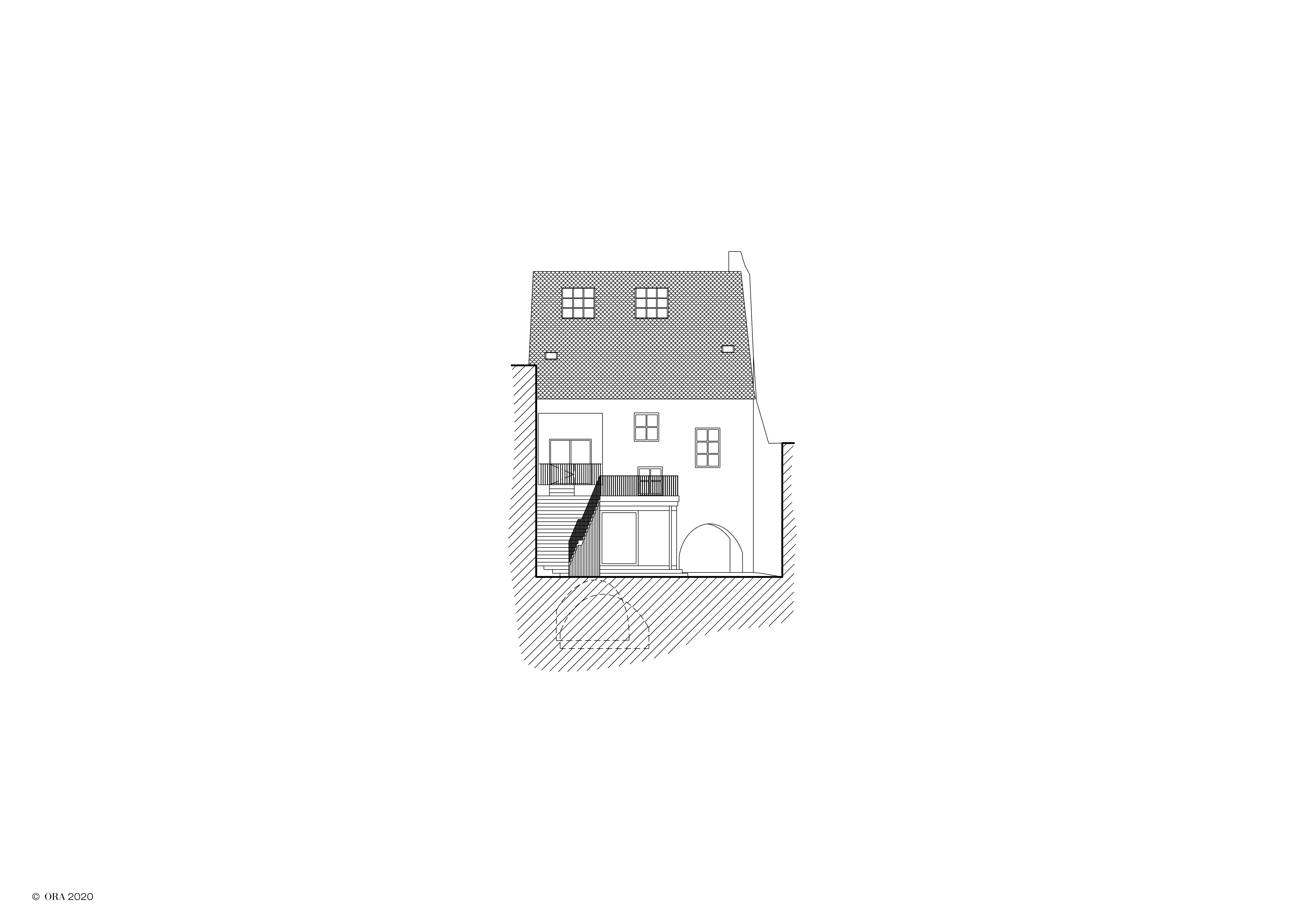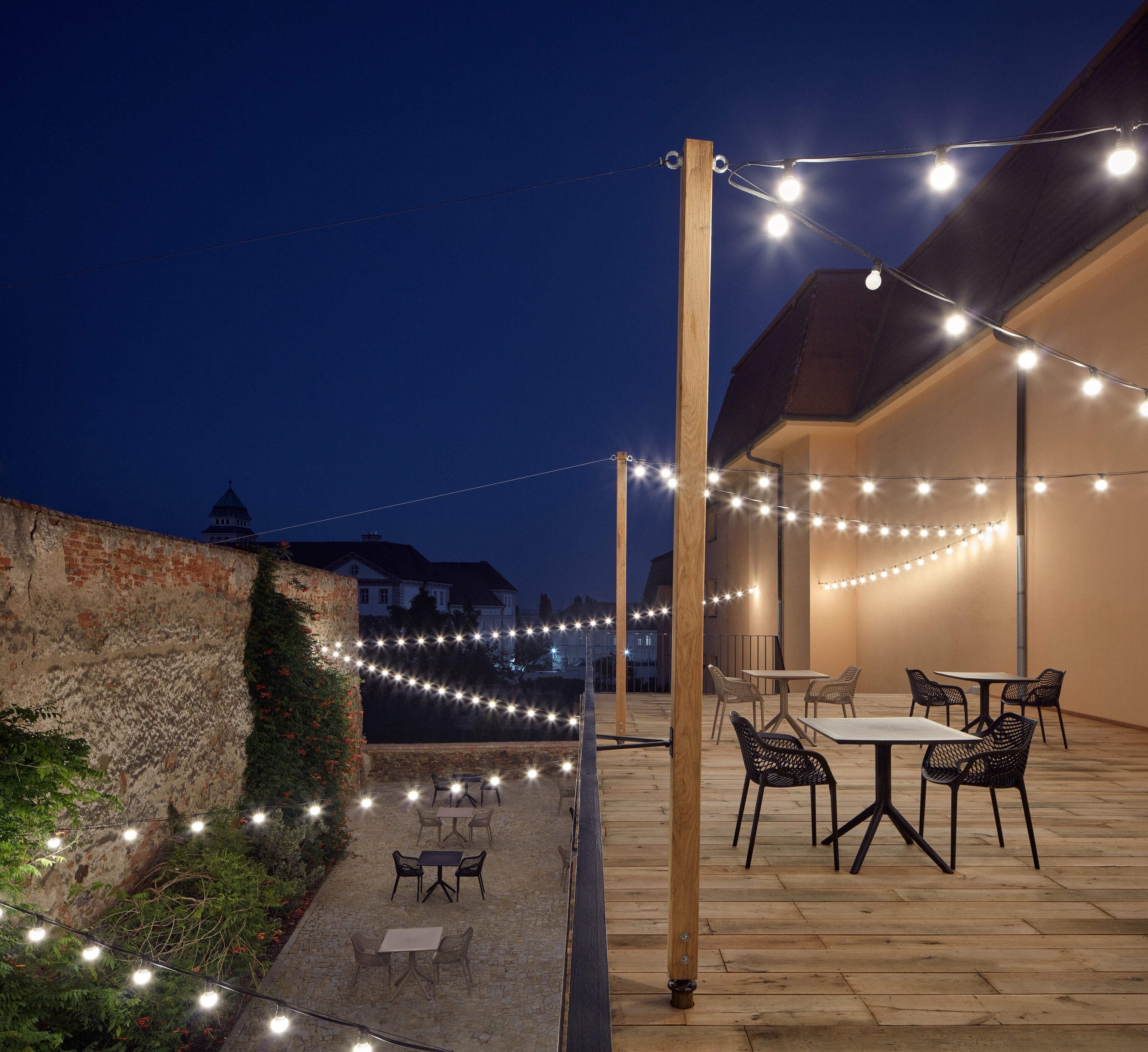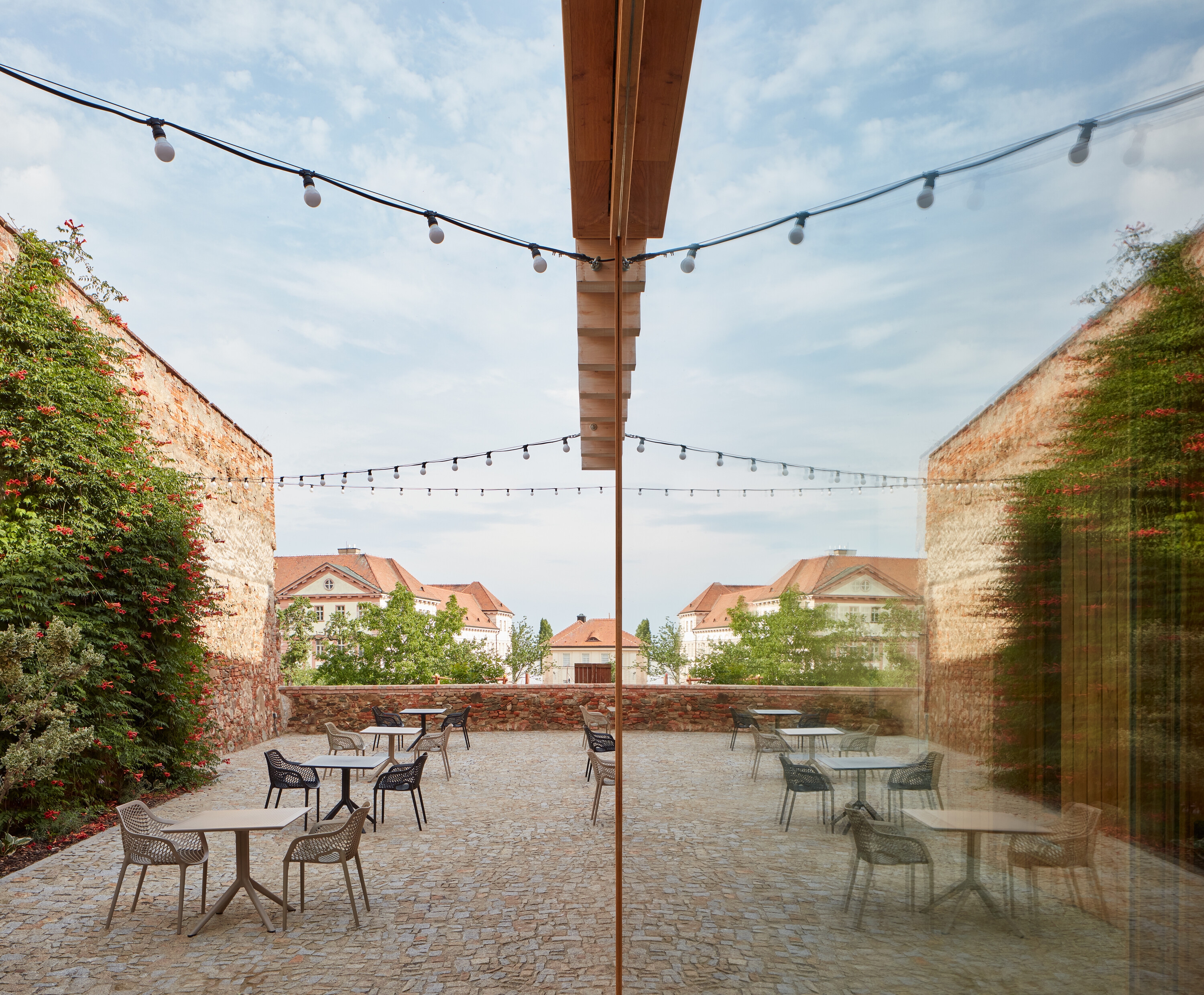 The yard is the most outstanding quality of the project. The narrow plot is situated between a pair of high walls. The first beautifully weathered stone wall belongs to the former Capuchin monastery. By contrast, the second wall is bare, belonging to a vast cultural centre from the late '80s that has not been in operation for many years now. The walls frame a magnificent view of the Capuchin garden and the representative courthouse. We further supported the view by lowering the enclosure wall and demolishing sheds standing in the courtyard. An operational necessity was to design an extension with service rooms in the yard. We decided to cling to the ugly wall of the cultural centre and thus set it aside, making the monastery walls stand out as much as possible.