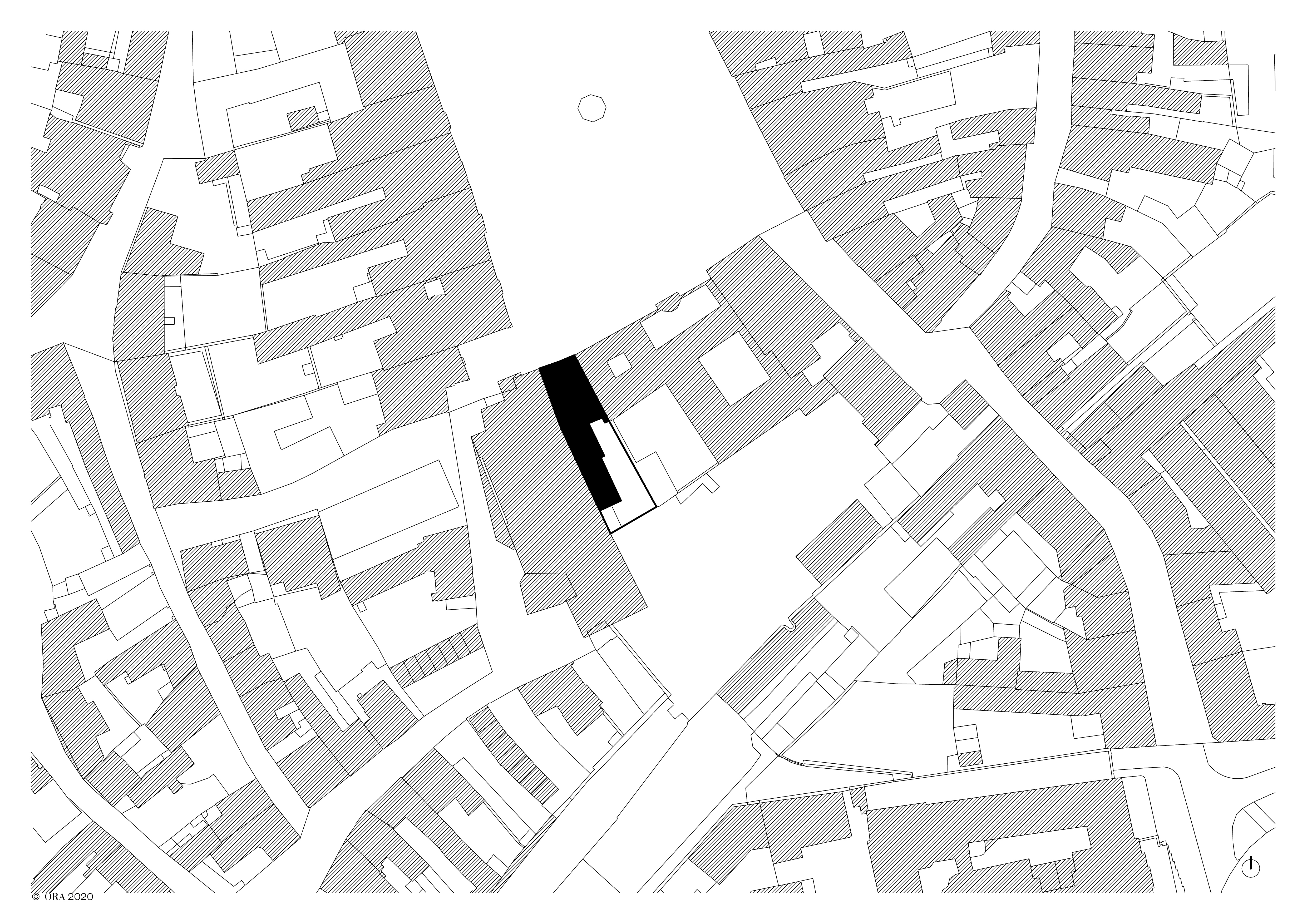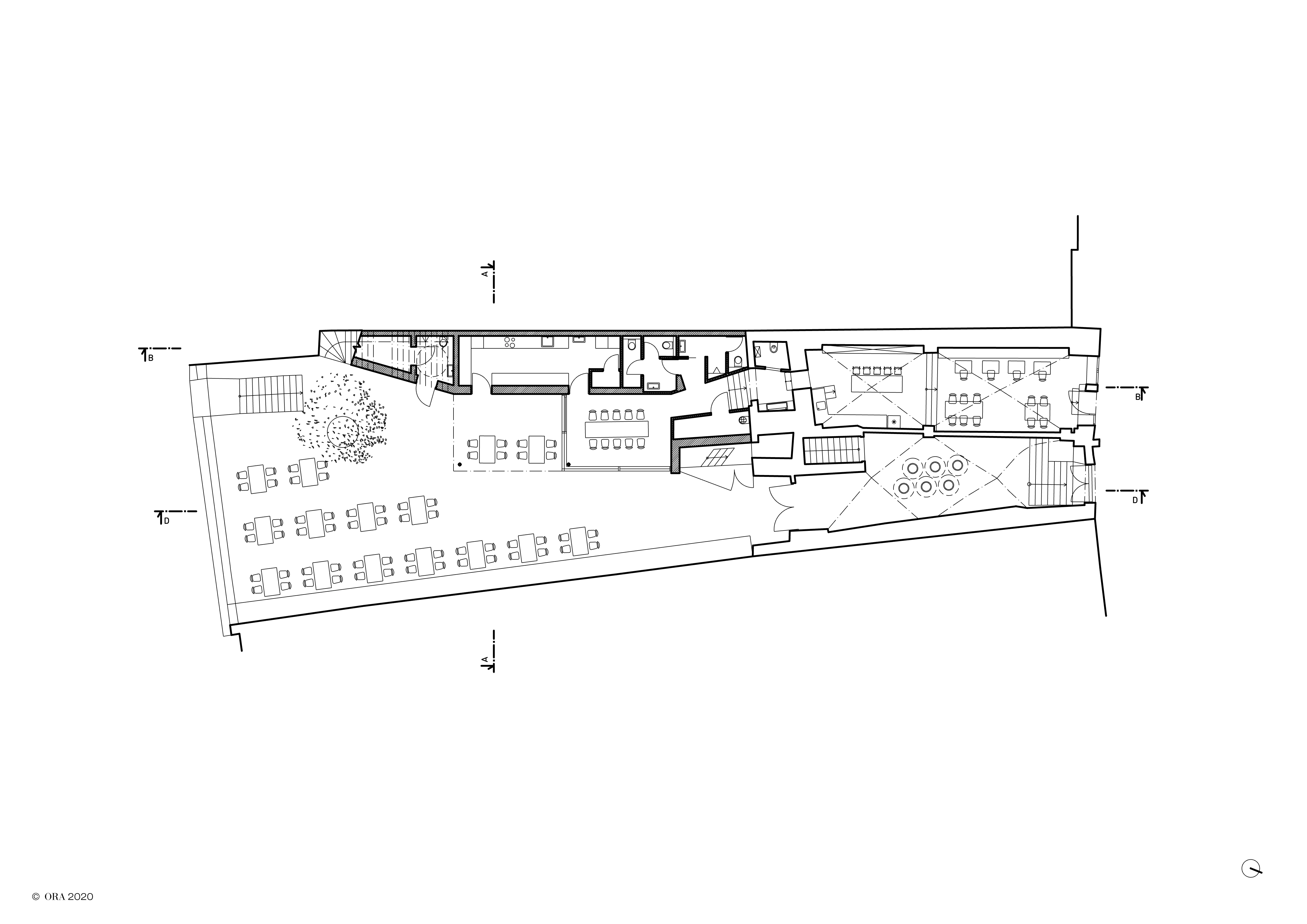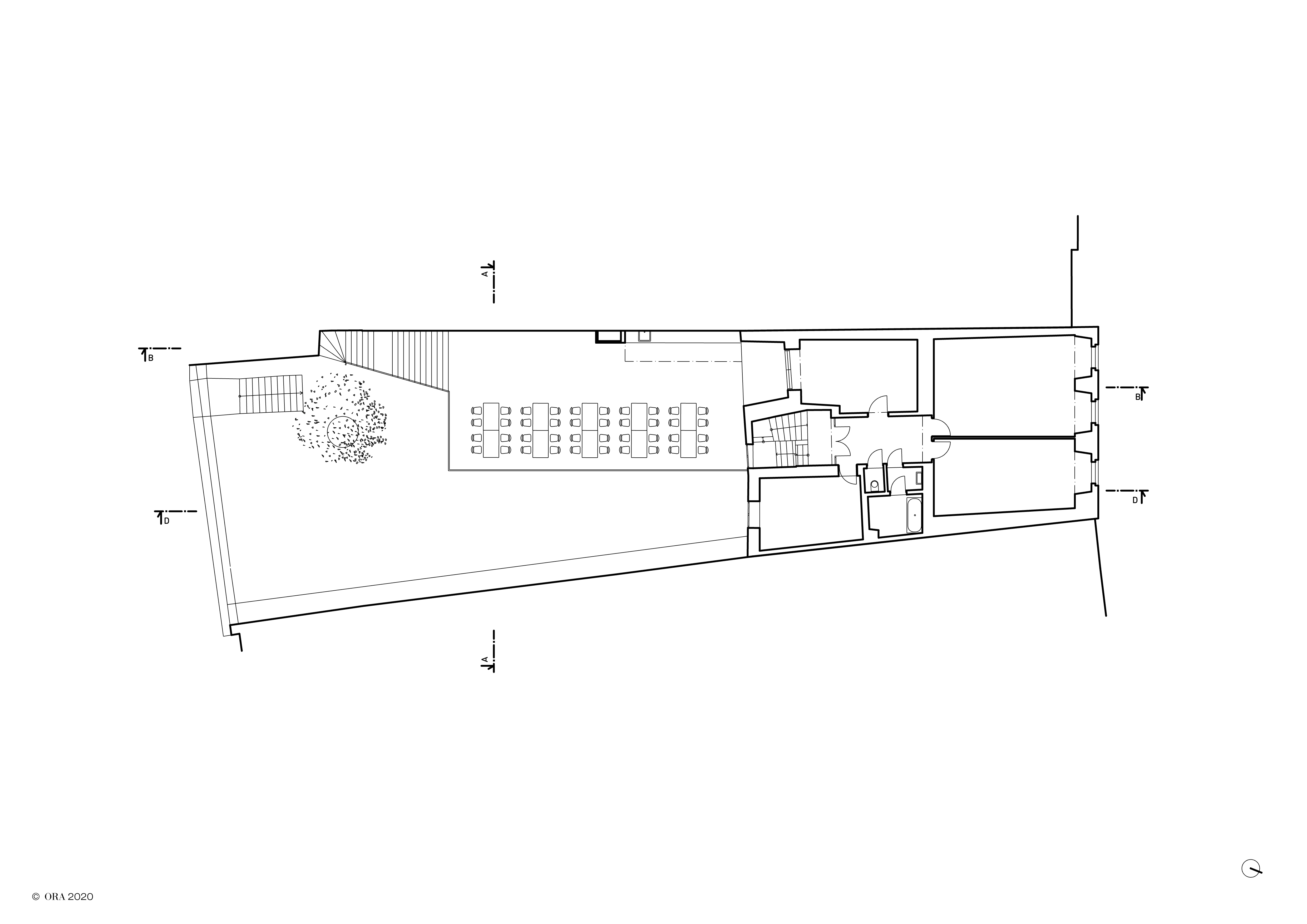 The yard is the most outstanding quality of the project. The narrow plot is situated between a pair of high walls. The first beautifully weathered stone wall belongs to the former Capuchin monastery. By contrast, the second wall is bare, belonging to a vast cultural centre from the late '80s that has not been in operation for many years now. The walls frame a magnificent view of the Capuchin garden and the representative courthouse. We further supported the view by lowering the enclosure wall and demolishing sheds standing in the courtyard. An operational necessity was to design an extension with service rooms in the yard. We decided to cling to the ugly wall of the cultural centre and thus set it aside, making the monastery walls stand out as much as possible.