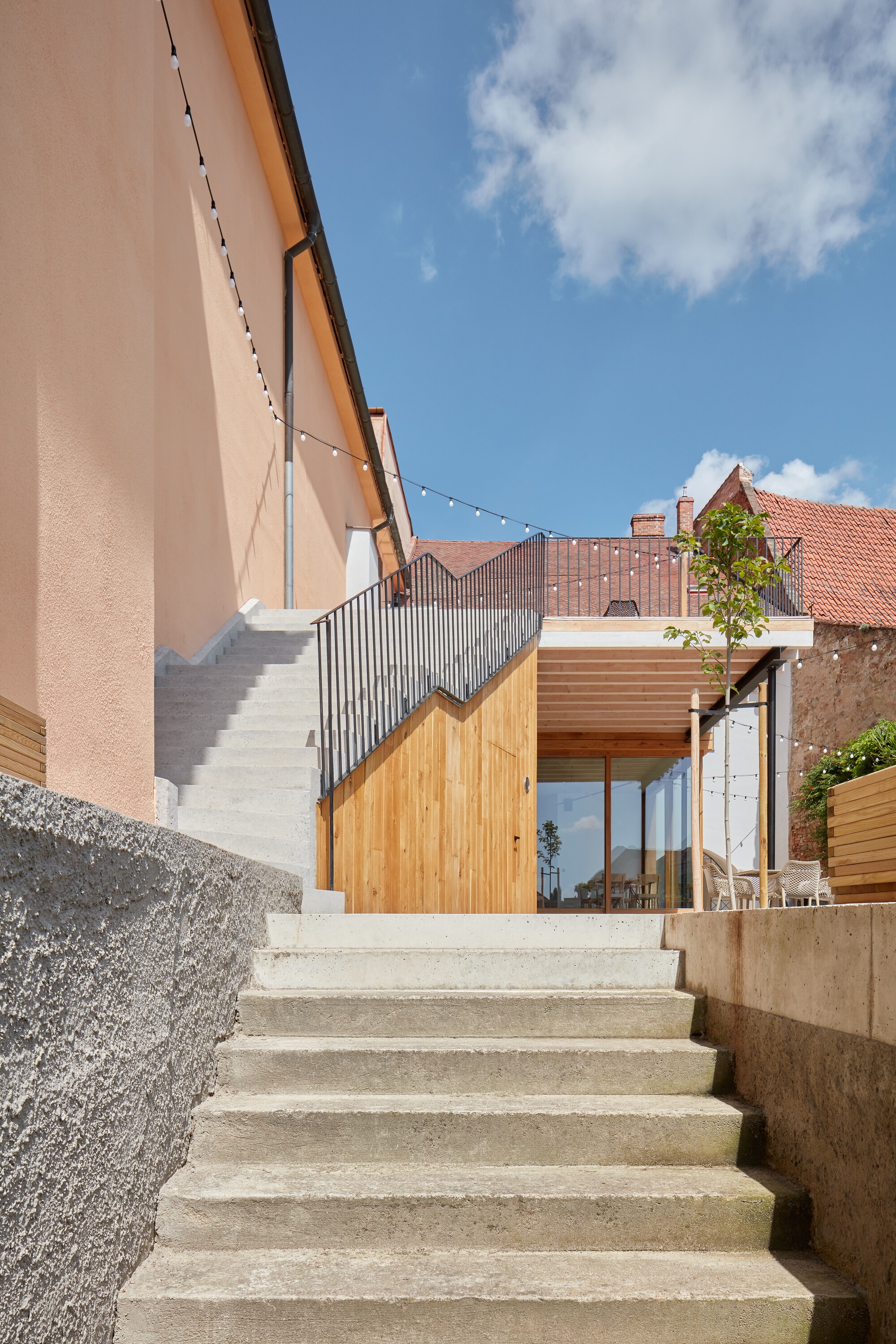 The extension stands in the footsteps of the former courtyard wing which was destroyed during the war. The only part of the former wing still standing today is the cellars which we designed to be used for the production premises. We designed a contemporary pavilion hidden from the outside, the roof of which is an observation terrace and an extension of the courtyard space. It is connected to the courtyard by an expanding concrete staircase. We combine wood, concrete and steel, materials that can age.