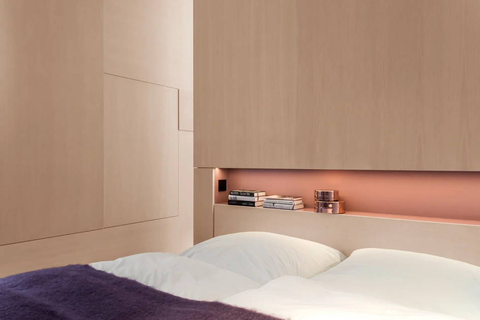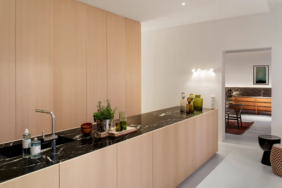 Das Ergebnis sind klare Räume mit der Anmutung einer Galerie. Ein Charakter, der unterstrichen wird durch das minimalistische Lichtkonzept von PSLAB. Vor glatten, weißen Wänden wurden die Möbel und Einbauten frei wie Exponate platziert. Ein hellgrauer Betonboden wird kombiniert mit geseifter Esche und Nero Marquina Marmor für die Kücheninsel, das Bad und eine langgestreckte Bank im Wohnzimmer. Die Küche selbst ist getrennt vom Entree durch eine Box, die Garderobe, Küchenschränke sowie ein im Innern voll verspiegeltes Gäste-WC beinhaltet. Dominierendes Element im Raum ist der zentrale und kommunikative Küchenblock mit integrierten Sitzmöglichkeiten z. B. für ein schnelles Frühstück. Unterstrichen wird das klare Design durch den verdeckten Einbau aller Beschläge und den Verzicht auf Türgriffe. Selbst die Kühlschranktür öffnet sich auf leichten Druck von alleine – mit Hilfe eines integrierten Motors.