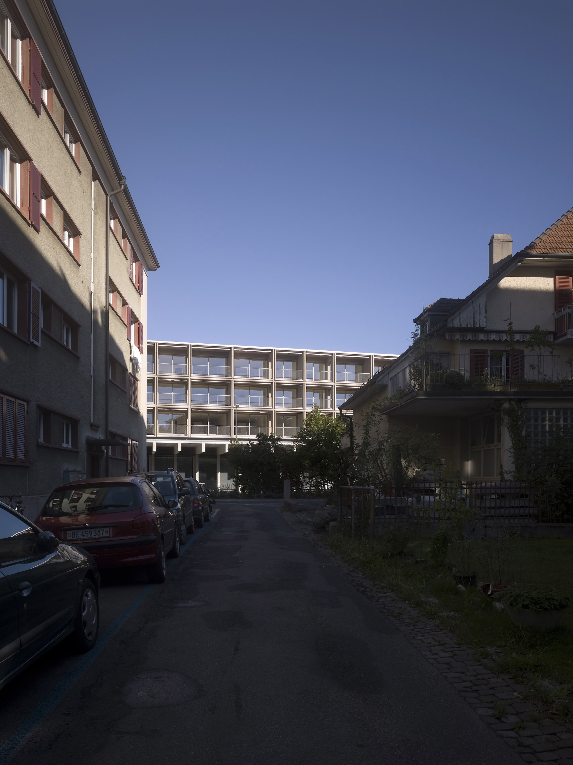 Die formale wie inhaltliche Überlagerung von Wohnen und Arbeiten im Wylerfeld widerspiegelt die besondere Stimmigkeit des Ortes mit dem einzigartigen sozialen kulturellen Mix des Lorrainequartiers. Die Lorraine versinnbildlicht unkonventionelles Wohnen und Arbeiten wie kein anderes Quartier in Bern. Vorfabrizierte Holzrahmenelemente werden auf die vormontierte Plattform „just in time“ gehievt und zusammengefügt. Dem Wohnen wird der attraktivste Ort zugestanden, nämlich über den Dächern der Nachbarschaft, mit Blick in die einzigartige Alpenkette des Berner Oberlandes, auf die attraktive Silhouette der Berner Altstadt mit Münster und Bundeshaus und in den offenen Horizont des Westens. Grosszügige, 2.50 m breite, offene Erschliessungslauben führen zu den einzelnen Wohnungseinheiten. Eine halbtransparente, individuell schiebbare Membrane trennt den öffentlichen vom privaten Raum. Die privaten Vorplätze dienen als praktische Abstellflächen für Kinderwagen u. dgl., aber insbesondere auch als Aufenthaltszone zum Geniessen der Nachmittags- und Abendsonne. Die Lichthöfe gewährleisten genügenden Lichteinfall wie auch eine optimale Luftumwälzung. Die durchgängigen Wohnungen profitieren ohne Ausnahme von den hervorragenden Situationsqualitäten und differenzierten Sonneneinstrahlungen. Die einfache, stringente Tragstruktur und damit Wohnungsstruktur, ermöglicht differenzierte Wohnungsgrundrisse mit verschiedenen Wohnungsgrössen. Basis des Wohnungsangebotes sind 3 1/2 und 4 1/2 Zimmerwohnungen, ergänzt mit wenigen 1 1/2 Zimmerwohnungen. Gerade für die im Lorrainequartier beliebte Wohngemeinschaft für Junge und Alte lässt das flexible Angebot keine Wünsche offen. Mit dem vorgeschlagenen Wohnungsmix sind 39 Einheiten vorgesehen. Von allen Wohnungen zugänglich, erhöht die grosse Spiel- und Aufenthaltszone im 3. Obergeschoss das Aussenraumangebot zusätzlich zum WylerPark.