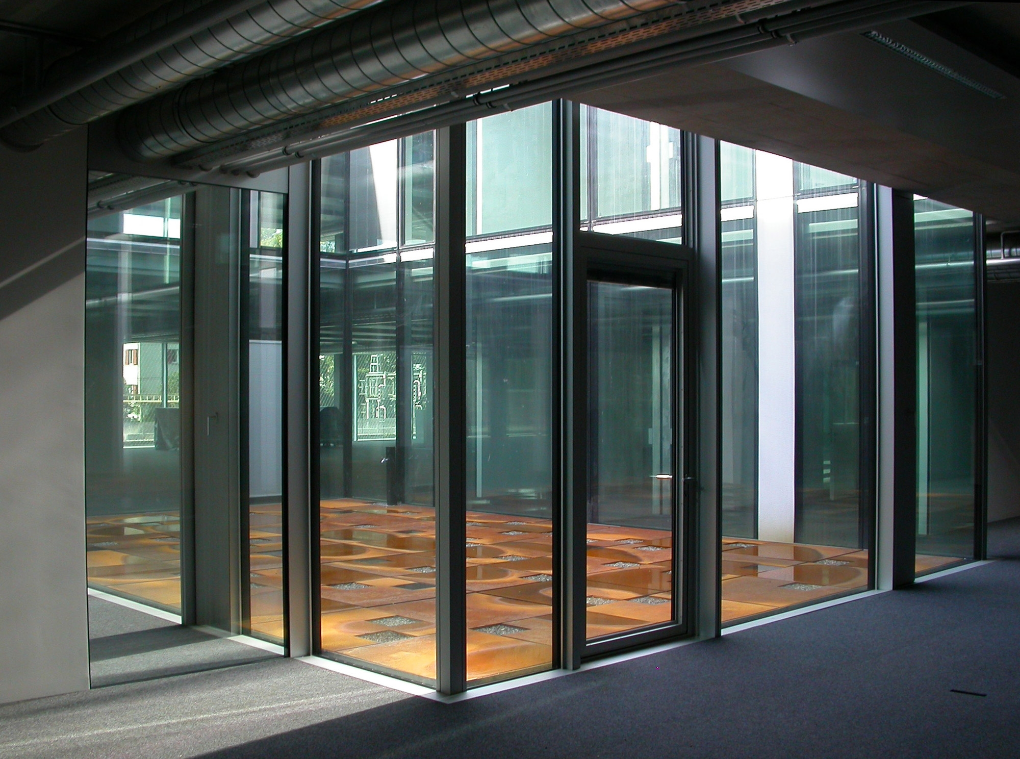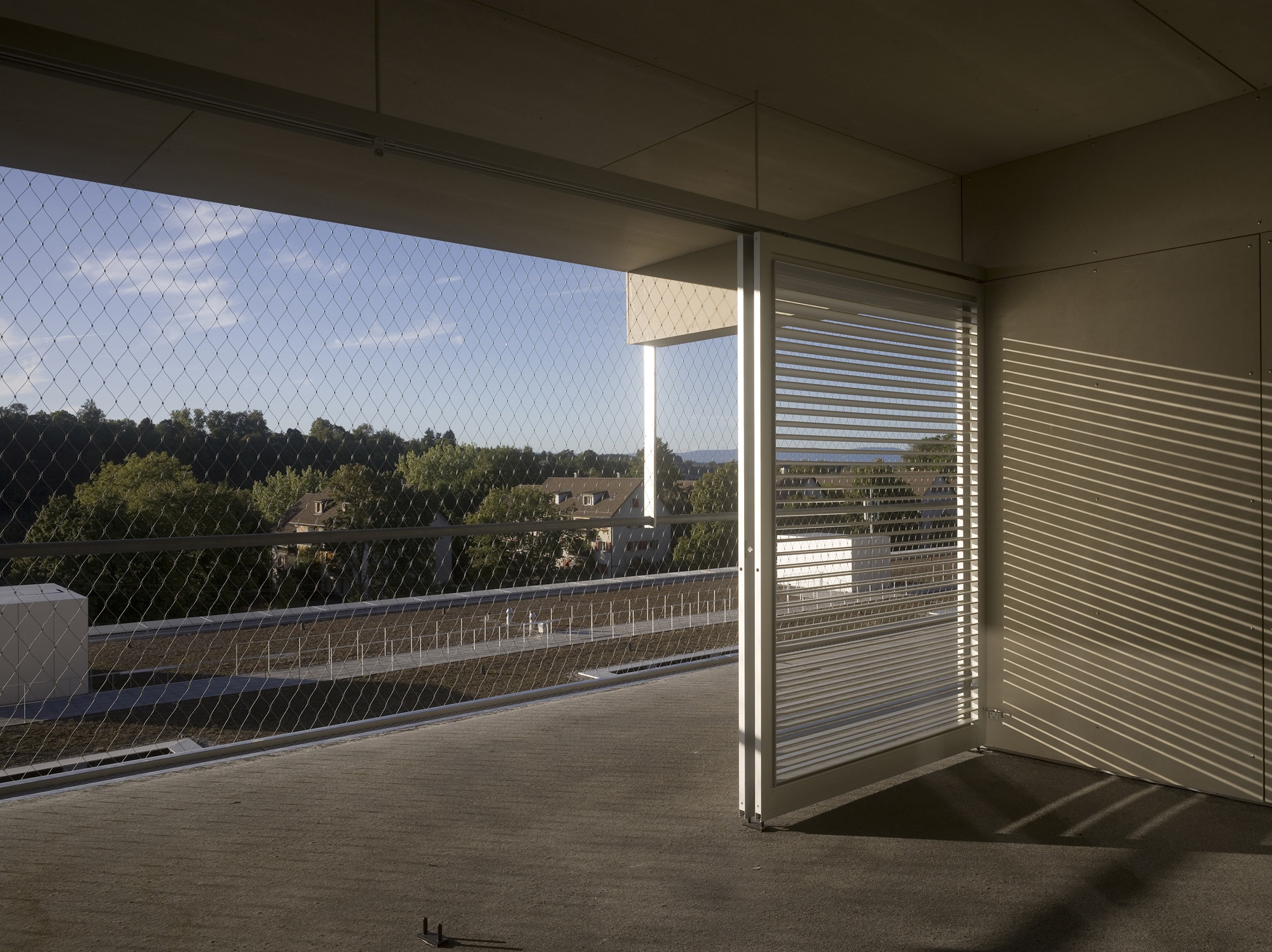 Durch die klar strukturierte Kanal- und Leitungsführung sowie die quer dazu angeordneten Deckenpaneele entsteht eine gleichmässige Rasterung der haustechnischen Installationen. Die Deckenpaneele sind ein Raumkonditionierungssystem, mit dem die Funktionen Heizen, Kühlen, Lüften, Schallabsorption, Grundbeleuchtung und Sprinkler erfüllt sind. Zwecks Abschirmung der kühlen Fassade im Winterbetrieb sowie zur strahlungstechnischen Kompensation der warmen Fassade im Sommerbetrieb sind die Akustik-Metallplatten bei den Paneelen in den Aussenzonen mit Wärmeleitschienen aktiviert. Diese Schaltung erlaubt bei einem mittleren U-Wert von < 1.2 W/m2K eine Lösung ohne Heizkörper im Fassadenbereich. Das Glas kann sich vom Boden bis zur Decke erstrecken, ohne dass dadurch der thermische Komfort im Fassadenbereich gefährdet ist. Die kompakte und gegliederte Anordnung aller Medien im Deckenbereich gewährleistet eine grösstmögliche Flexibilität der Raumnutzung und Raumeinteilung. Mit der Installation einer Regenwassernutzungsanlage, mit eigenem Verteilnetz auf alle WC, Urinoirapparate und die Auslaufventile der Aussenbewässerung, wird gewährleistet, dass der Trinkwasserbedarf minimiert wird.
