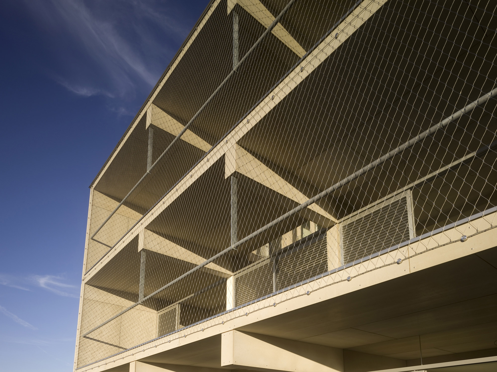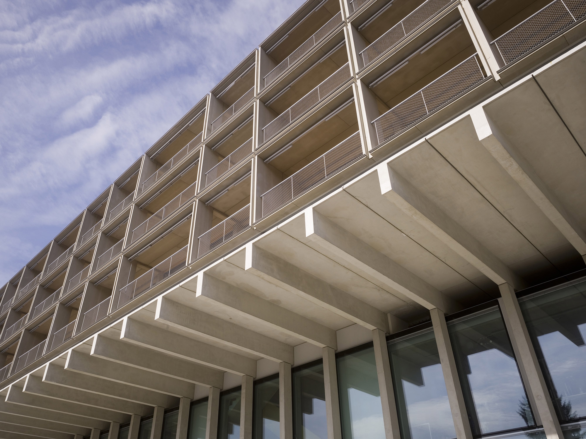 Die Fassadengestaltung entwickelt sich aus der Baustruktur heraus und trägt dem Anspruch Rechnung, ca. alle 1.20m mit inneren Trennwänden anschliessen zu können. Eingespannt zwischen den Decken wird durch die modulare additive Teilung der Fassadenelemente ein vertikales industrielles Erscheinungsbild erzeugt. Im Bereich der gedeckten Terrasse wird der Fassade die Tragstruktur für die Wohncontainer vorgelagert, welche massgeblich und raumhaltig die Architektur prägen. Die Sockelfassade zu den Geleisen erhält über die enge Rhythmisierung der Betonstützen den angestrebten geschlossenen Sockelcharakter.