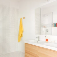 The bathroom project follows the imprint of the house, with white ceramic cladding in the shower, plastered walls, and concrete flooring.