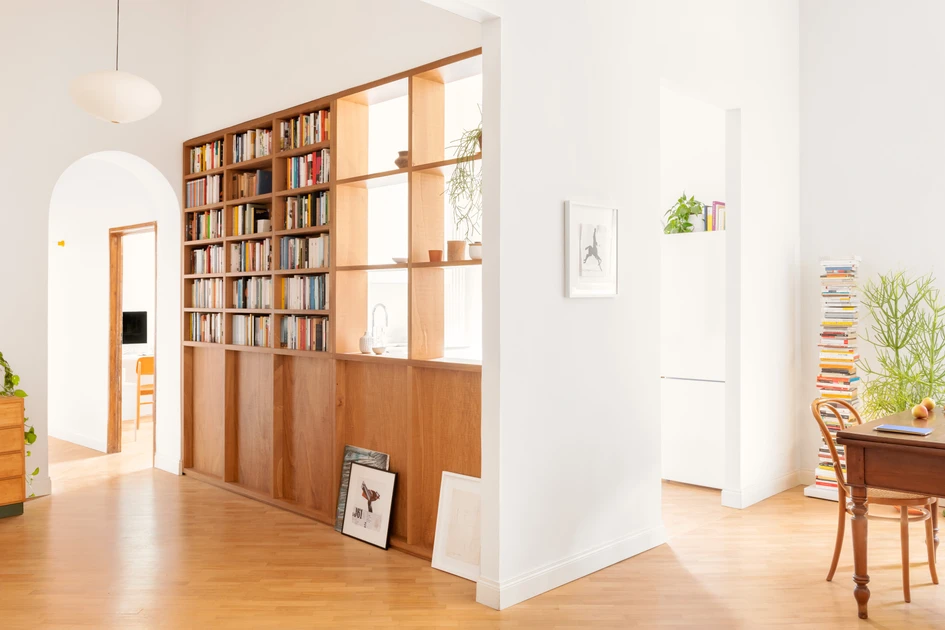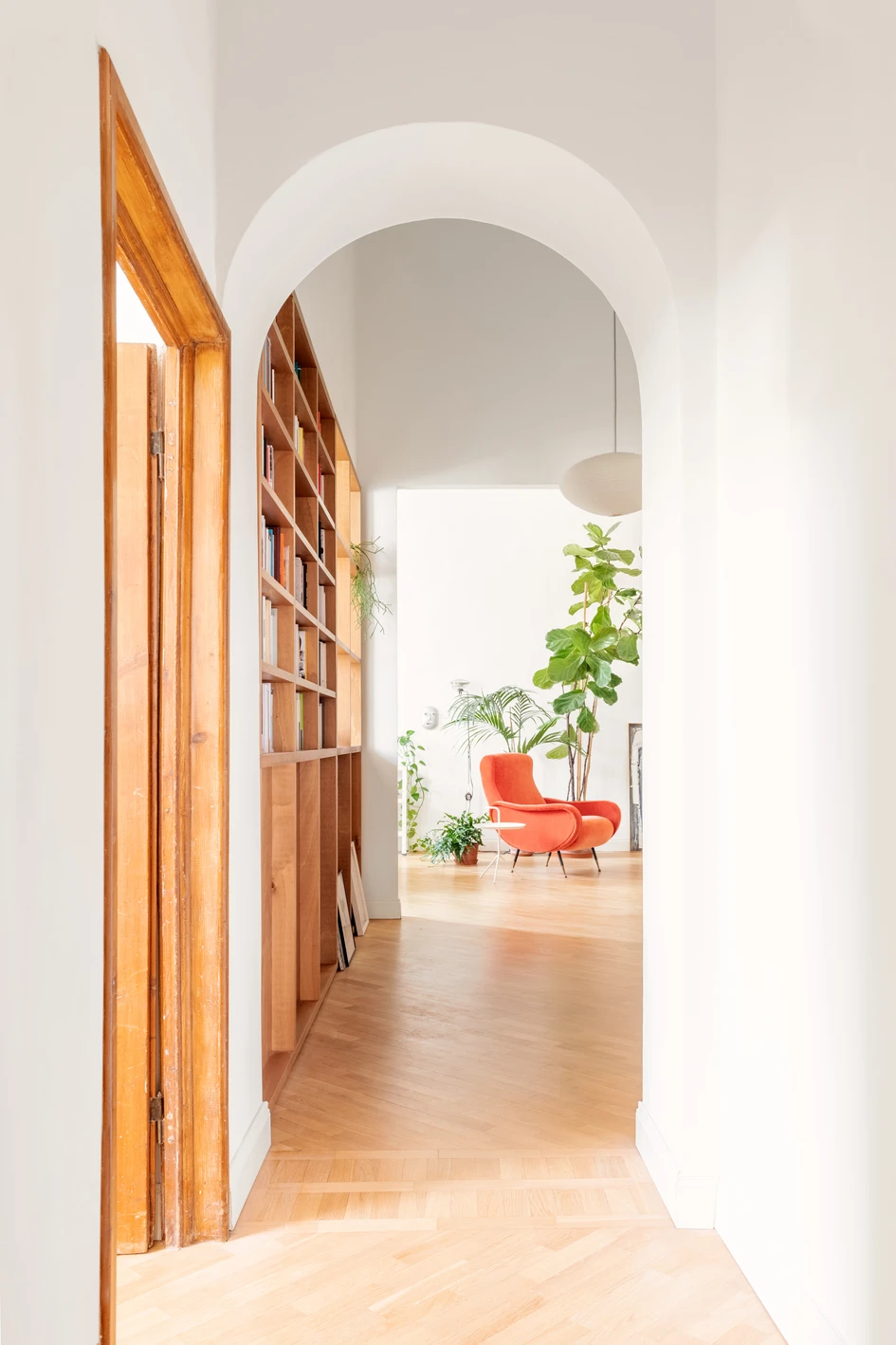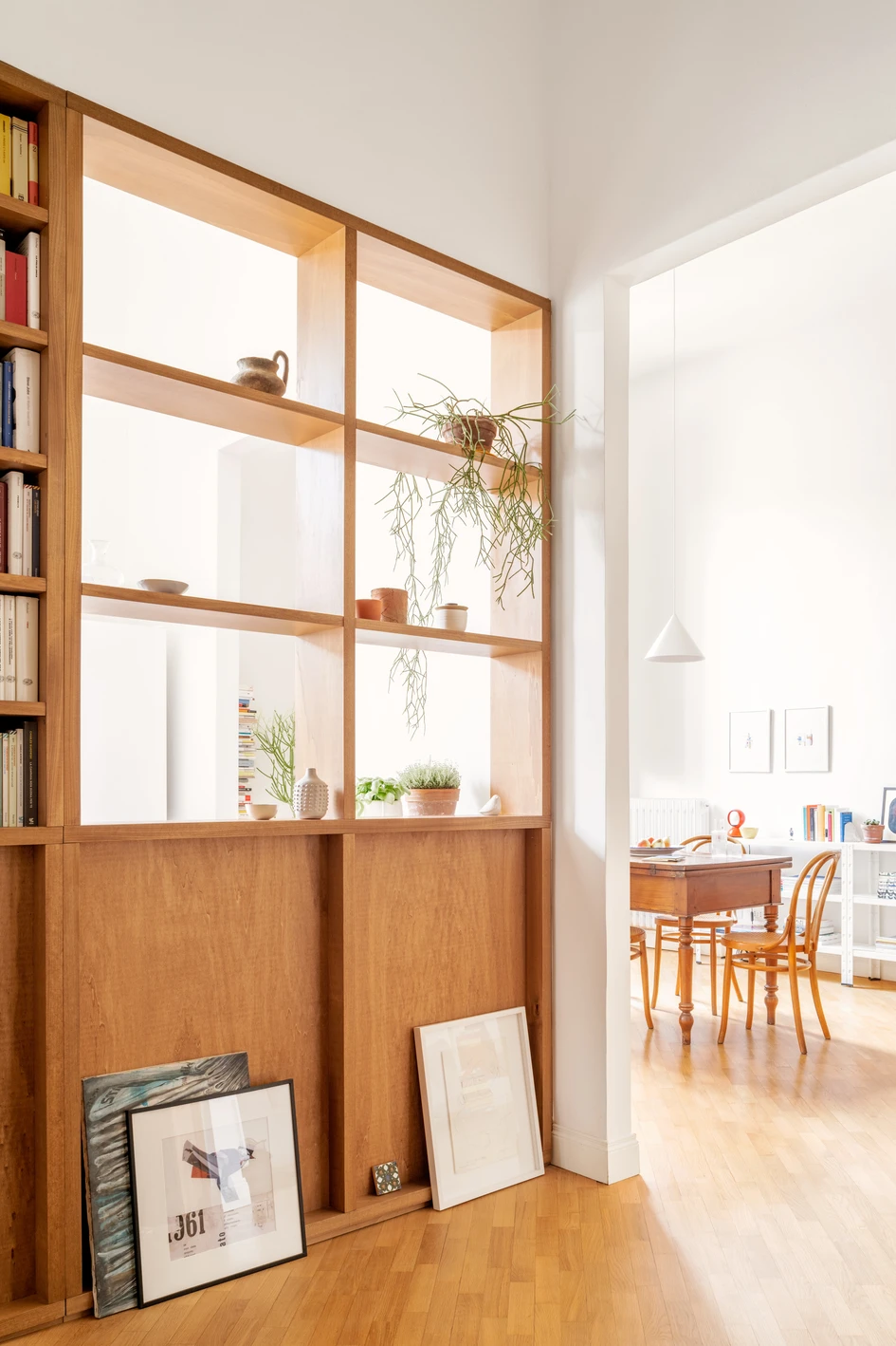 The project integrates a key element in the central distribution space: a wooden device that serves as a wall-filter between the entrance and the new kitchen area, allowing light to permeate to the hallway. This equipped wall becomes a central element in defining the space and features of the house, with a regular, “Franciscan” geometry that places the couple’s design library at its center.