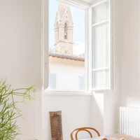 The apartment impressed them immediately with its light, streaming in through four large south-facing windows. Each window offers an unusual view of the bell tower and the rear of the Basilica of Santa Croce, typically difficult to observe from this perspective. High ceilings and the presence of a spacious and bright second level in the attic add further value to the apartment.