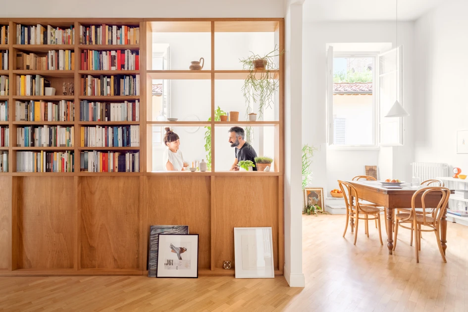 The filter operates on two fronts, with two different perspectives: on one side, it acts as a bookshelf, while on the other, it shapes and rhythmically frames the kitchen, enclosing it with white ceramic cladding. This creates a visual connection between the spaces.