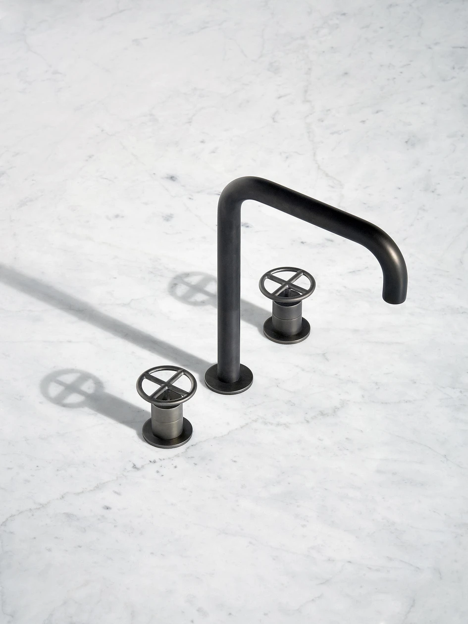 Die mattschwarzen Fantini-Armaturen von Fontane Bianche Salvatori mit ihren U-Boot-ähnlichen Steuerrädern (oben) zeigen ihr industrielles Design mit vertikal verlaufenden Rohrleitungen (unten)