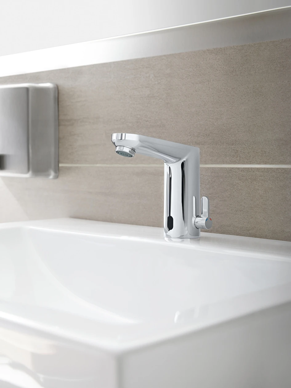 Die Essence E Armatur von Grohe bietet viel Technik in einer breiten Armatur (oben), während der breite architektonische Sockel von Rubinetterie Stella einen lang anhaltenden klassischen Stil hat (unten)