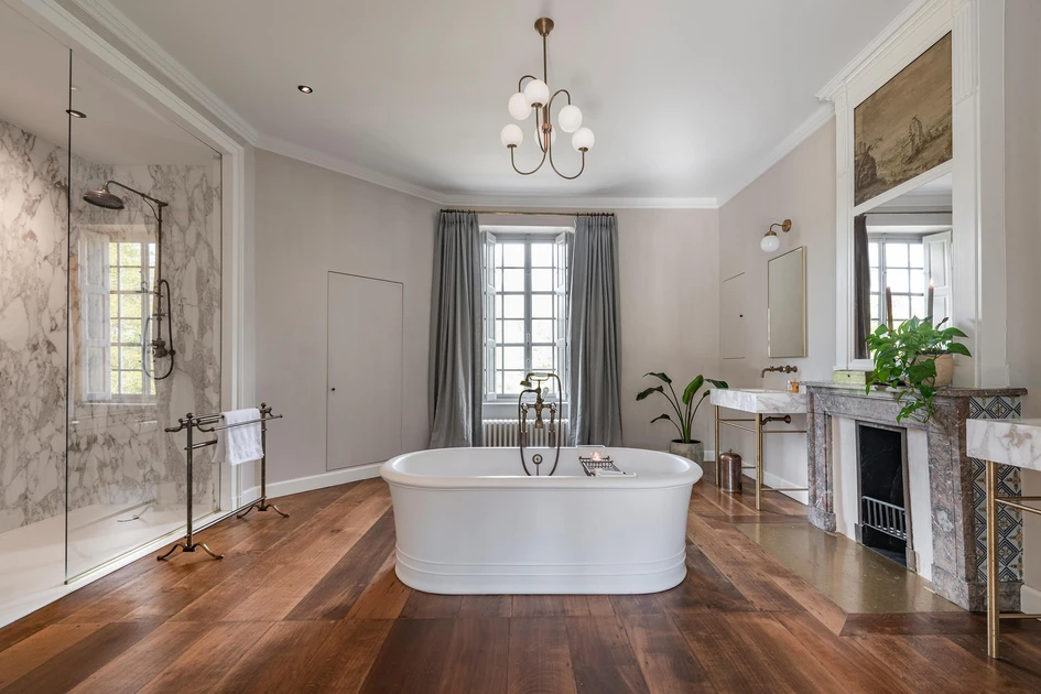 Ein abgenutztes Messing-Finish verleiht den Produktlinien von Kenny & Mason, die für das belgische Schloss Veulen ausgewählt wurden, einen authentischen Vintage-Look. Dazu gehören auch individuell gestaltete Armaturenköpfe mit dem Wappen des Schlosses, die ihnen buchstäblich eine eigene Identität verleihen.