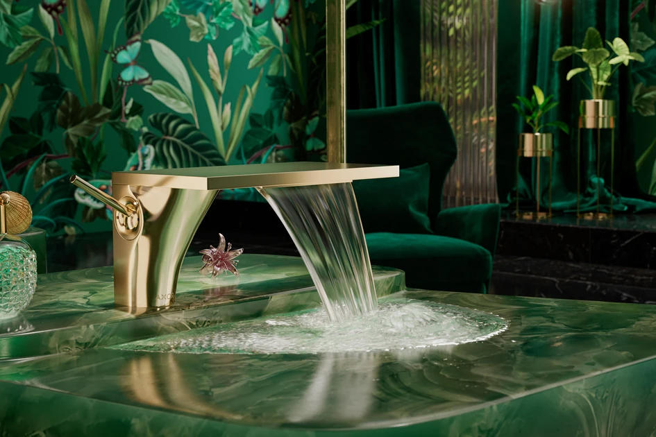 Die Armatur Massaud von Axor zelebriert die Natur des Wassers, indem sie seinen natürlichen Fluss visualisiert. Sie hat einen breiten Wasserfallauslauf (oben), während Starck zeigt, wie sich das Wasser wie in einem felsigen Bach windet und dreht (unten)