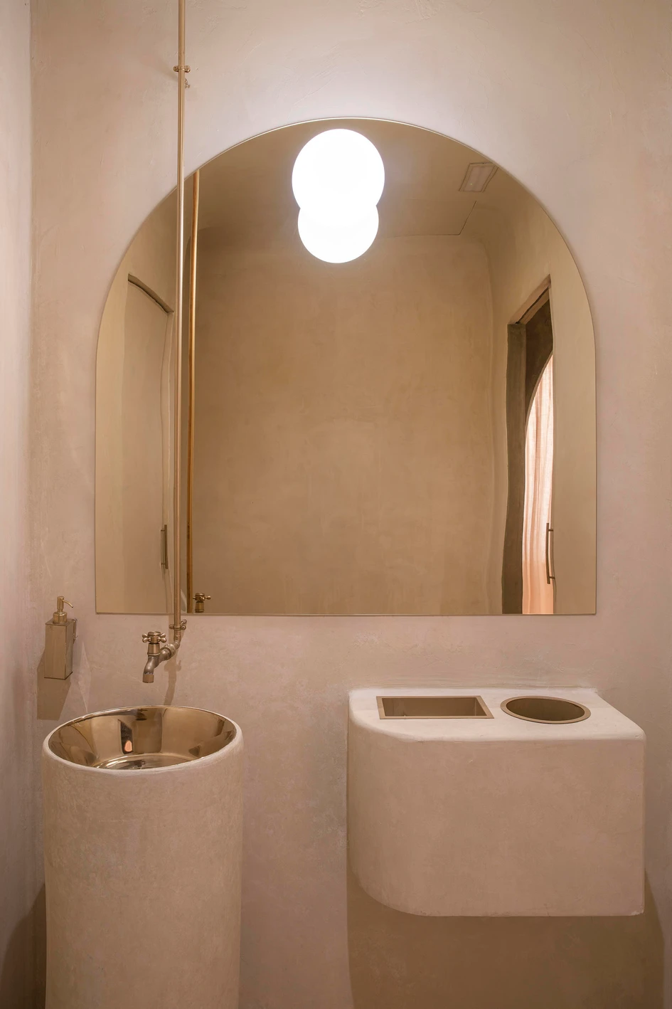 Schloss Veulen stellt die abgenutzte brassMessingoberfläche seiner Armaturen zur Schau, wobei sowohl die Badewanne als auch das Waschbecken in der Mitte ihre Rohrleitungen freilegen. Derselbe rohe, unbearbeitete Stil wird in dem viel moderneren Waschraum des Restaurants Living Bakkali von Masquespacio in Valencia verwendet, wo der lange Arm des Waschbeckenhahns aus der Höhe herausragt und wie ein Wasserhahn im Freien herabfällt. Der Effekt wird durch die Positionierung eines Spiegels hinter der Armatur akzentuiert, was die Wirkung verdoppelt.Der lange Arm der Waschtischarmatur ragt aus der Höhe und fällt nach unten wie ein Wasserhahn im Freien