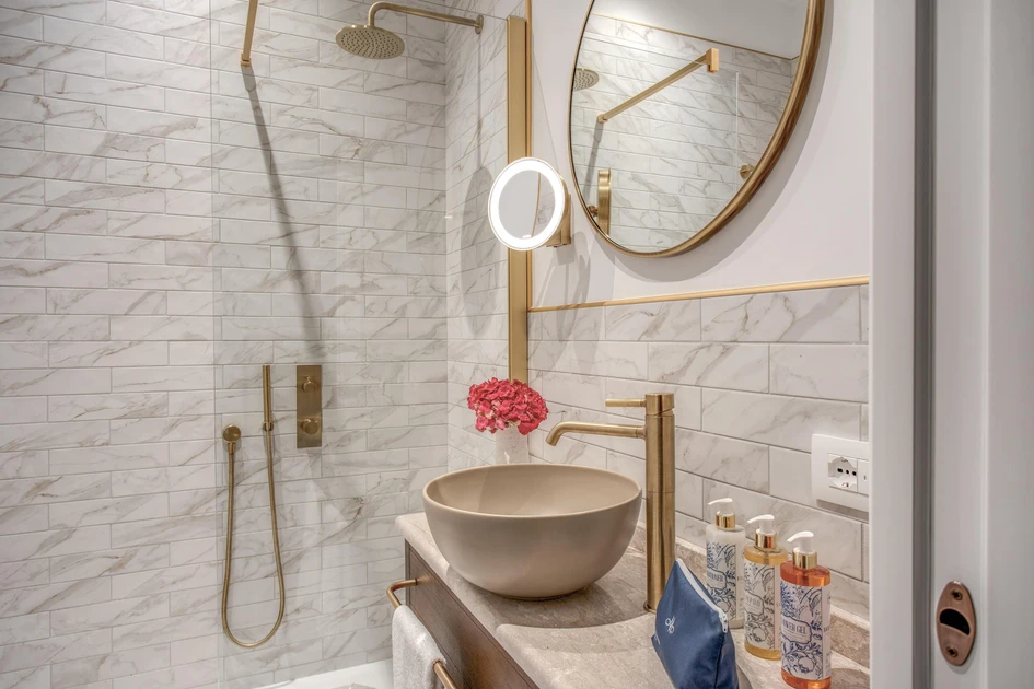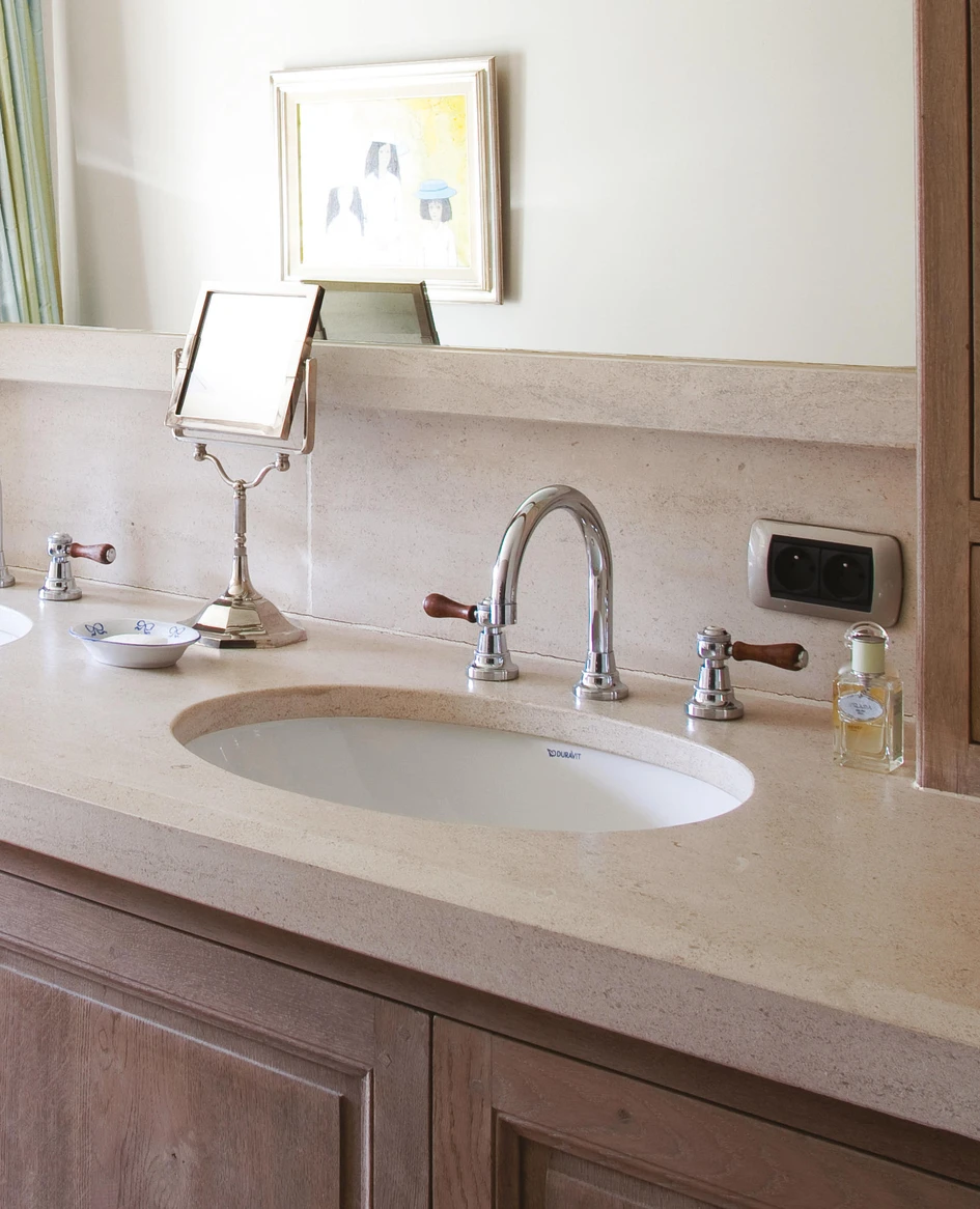 Durch die Ergänzung von Badoberflächen und -halterungen mit markanten Armaturen können Designer charaktervolle Sanitärräume schaffen, ohne sie dekorativ zu überladen.