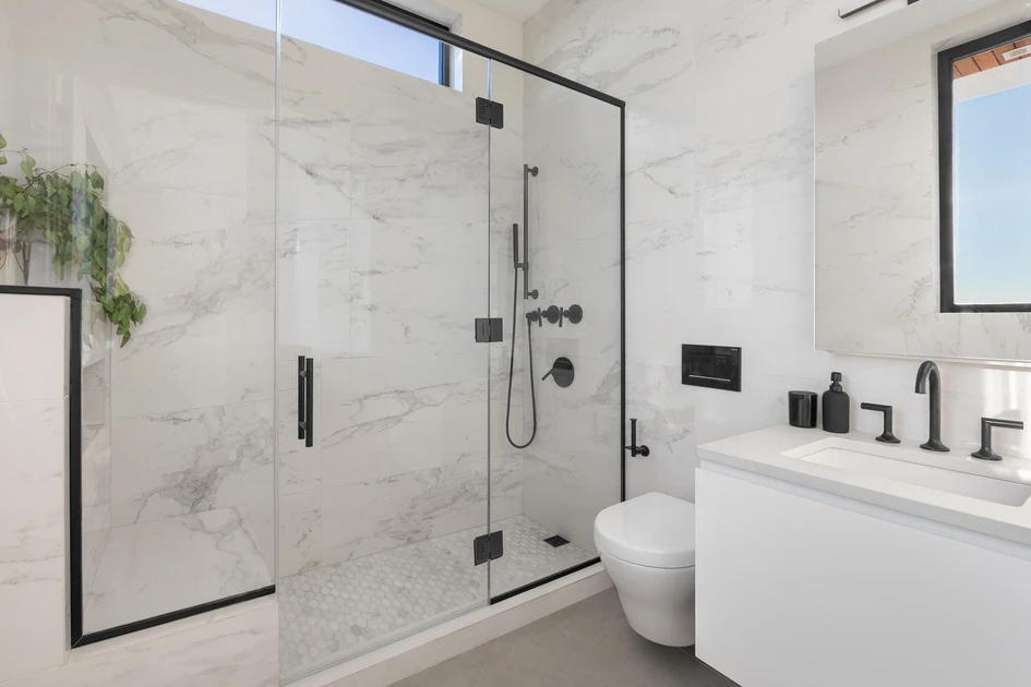 Es mag ein Supertrend sein, der bei zeitlosen Inneneinrichtungspuristen ein Augenrollen hervorruft, aber mattschwarze Armaturen, die in kontrastreich gestalteten Sanitärräumen wie dieser Luxuswohnung in New York kombiniert werden, machen die Gestaltung auffälliger Räume leicht. Ähnlich wie beim Auftrag von Tinte auf eine gut gemachte Zeichnung braucht es jedoch Vertrauen.Die Verwendung eines monochromen Effekts fühlt sich an, als würde man mit einem Füller über eine Bleistiftzeichnung gehen. Ähnlich wie das Auftragen von Tinte auf eine gut ausgearbeitete Zeichnung erfordert es jedoch Selbstvertrauen