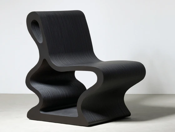 Die Sitzskulpturen der Serie SW sind aus Hochleistungs-Holzfaserstoff gefertigt und erscheinen wie dunkle, geschwungene Bänder