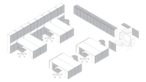 Oben: Das leicht konfigurierbare KEYPAD Sitzsystem. Unten: Das neue, modulare KEYBOARD Schreibtisch- und Aufbewahrungssystem von Objekten Systems benötigt kein Werkzeug für die Montage und bietet mit seinen Stoffseitenteilen ein Akustikmanagement