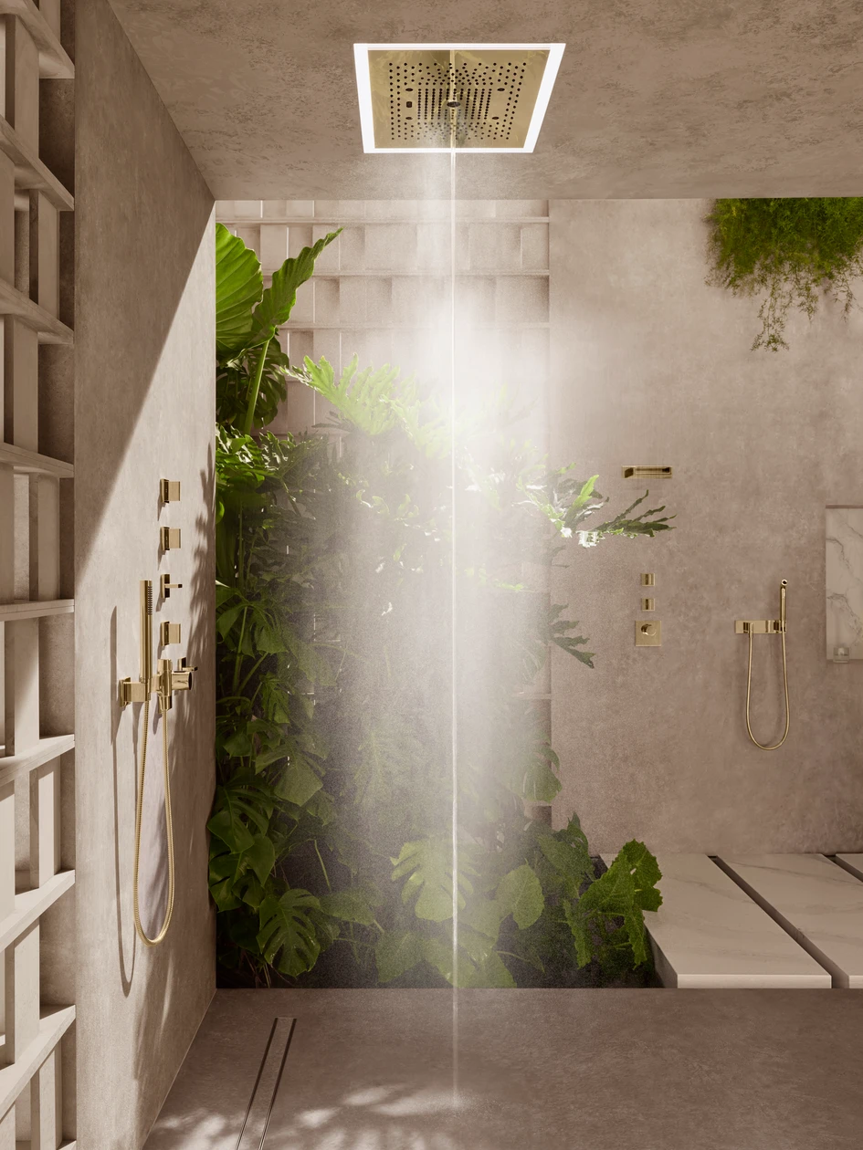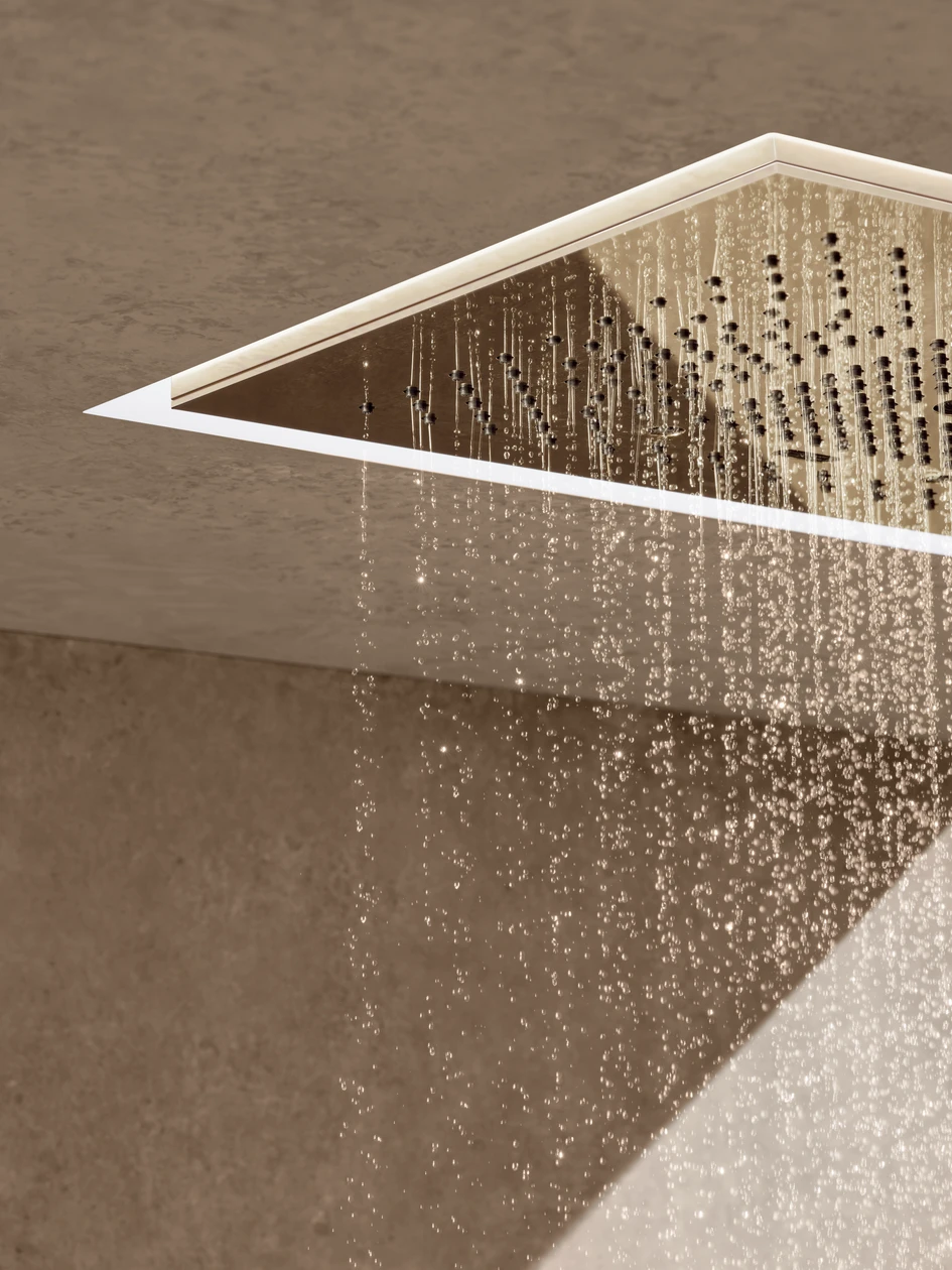 Faszinierend bleibt jedenfalls auch die elegante Verpackung dieser Technologie. Auch hier kann aus dem Vollen geschöpft werden, denn es stehen sieben verschiedene Oberflächen zur Auswahl, von Chrom über Champagne mit 22-karätigem Gold bis hin zu Dark Platinum gebürstet. Mit diesen individuellen Optionen fügt sich das Regenpaneel harmonisch in jede Badlandschaft ein.Mit einem eleganten Design und verschiedenen Wirkungsprinzipien geniesst man ein kraftspendendes Duscherlebnis, wie es so noch nie gegeben hat