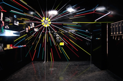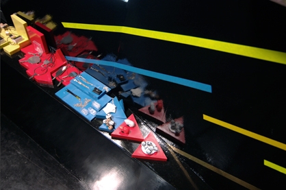 Als Raum-in-Rauminstallation des Künstlers Arne Klaskala überrascht und irritiert er durch Unerwartetes. Ecken und Kanten verschieben Perspektiven, tiefschwarz lackierte Oberflächen lassen eintauchen in wechselnde Zeichen. Zeichnungen verflüchtigen sich, Illustrationen perlen ab. Das begehbare dreidimensionale Skizzenbuch bringt den Besucher ausser Balance.