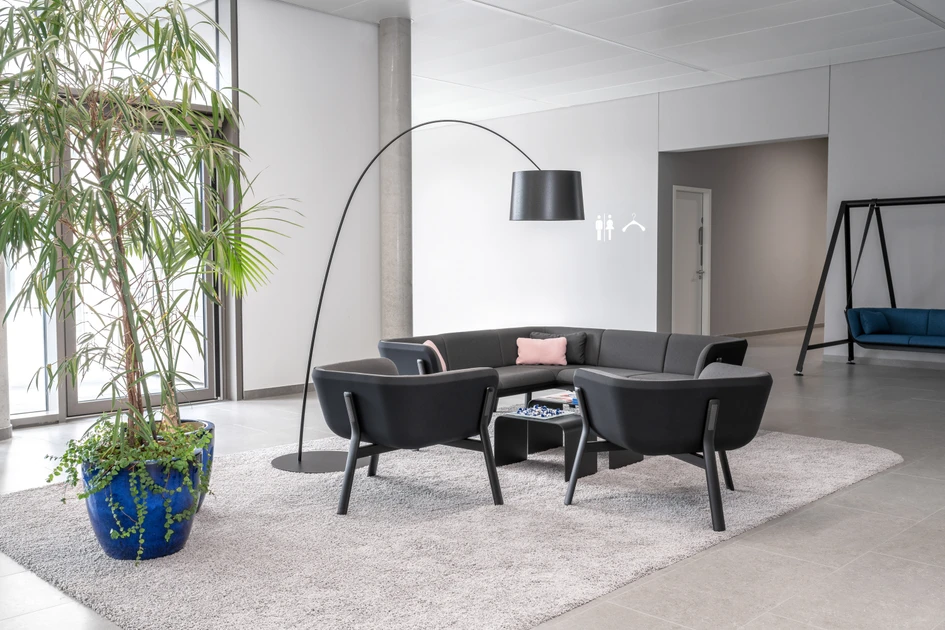 Variabilität open end: Von der offenen Sitzgruppe mit den Sesseln HUB 1 und dem Sofa HUB corner (ganz oben) bis zum abgetrennten und ruhigen Besprechungsort mitten im Raum mit dem Element HUB 3 pod (oben)
