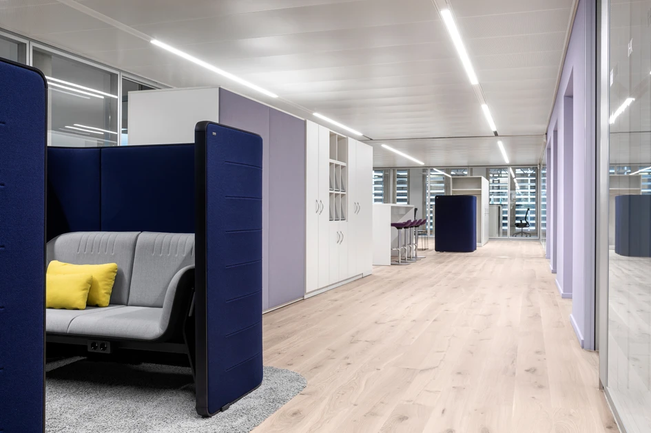 Drei fürs Wesentliche: Das variable System HUB ermöglicht nicht nur perfekt abgestimmte Arbeitsszenarien, es bietet auch in Zeiten des Abstandhaltens formschöne Rückzugsräume und Zonierungskonzepte