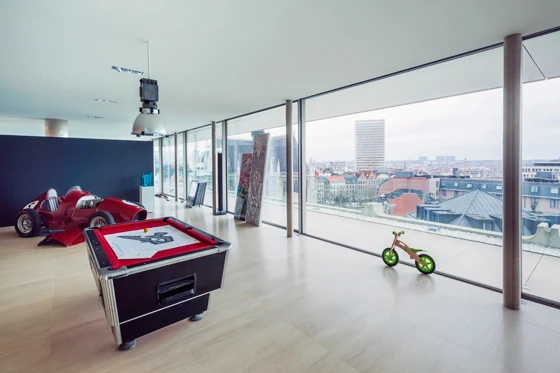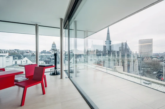 Die Wohnung ist rundum mit großflächigen und individuell angepassten Fenstern versehen und ermöglicht den Bewohnern einen spektakulären Ausblick über die Dächer Brüssels, sowie auf den berühmten Justizpalast in der Ferne. Das von der KELLER AG entwickelte Design-Schiebefenster minimal windows® ermöglicht zudem das maximale Eindringen von natürlichem Tageslicht.