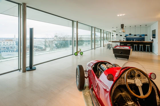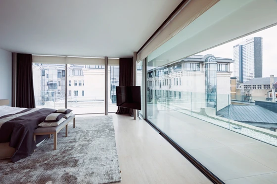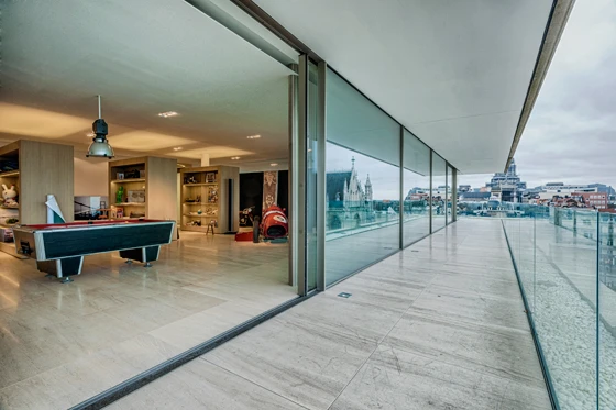 Der traumhafte Balkon, der sich über die gesamte Länge des Penthouse erstreckt, lädt zum Verweilen ein und vermittelt das Gefühl von Freiheit in der europäischen Metropole. Die optisch sehr ähnlichen Bodenfliesen des Innen- und Außenbereichs schaffen im Zusammenspiel mit den barrierefreien minimal windows® Schiebetüren der KELLER AG einen grenzenlosen Übergang und vergrößern den eigentlichen Wohnraum.