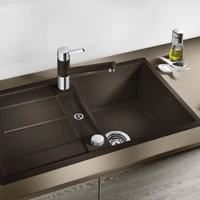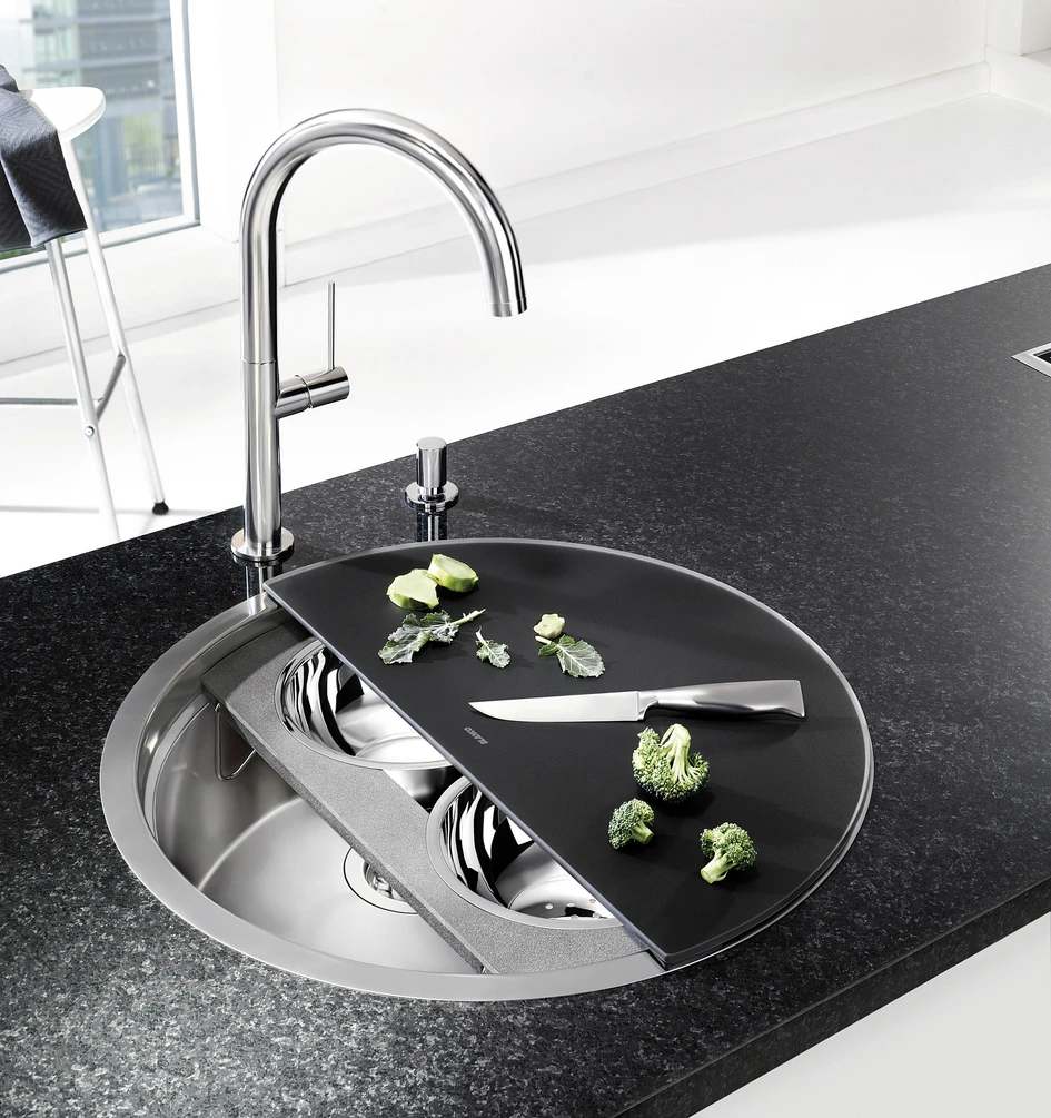 Another way to add volume is with a deeper farmhouse-style sink. These are the perfect way to complete a rustic kitchen look but the low-slung bowls take up more under-counter cabinet space and can be uncomfortable for taller users. Meanwhile, if worktop space is tight, smaller circular sinks like Blanco’s Ronis are suitable for micro-kitchens or bar kitchens. Ronis even comes with accessory trays to use the same space for chopping and washing.
