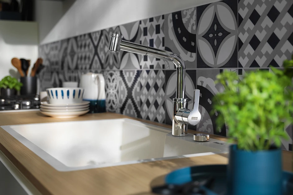 Slotting into a pre-cut hole, over-mount sinks are simple to install but can be harder to clean, and their exposed seam can be susceptible to leaks over time. Meanwhile, under-mount sinks like Franke Home Solutions’ Mythos allow the fine finish and edging of a luxurious worktop material to draw the line instead. By positioning the bowl underneath the worktop edge, meanwhile, users are able to wipe worktop mess away with ease. Instead of going down, the Up sink from Scarabeo goes up. With a full frame that fits flush to the work surface, Up makes cleaning easier than with a traditional over-mount sink, too.