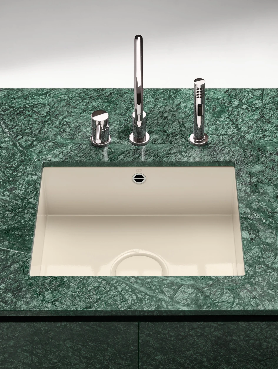 Gone are the days when a gleaming great hunk of stainless steel was forcibly thrown at a lovingly curated kitchen palette. In modern times, many kitchen sinks come in spotless white ceramic that goes with anything. The Sink CS from HIMACS uses the technologically advanced solid surface material to seamlessly mould a full work surface together with a sunken sink. If a specific colour is desired to match or contrast with an existing palette, meanwhile, then composite sinks open up a variety of colour options. Both solid and easily cared for, however, steel should not be so quickly overlooked. Using glazed steel, Dornbracht’s sinks come in a variety of colour options, too.