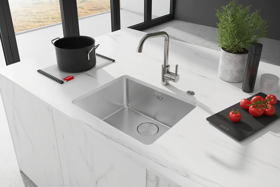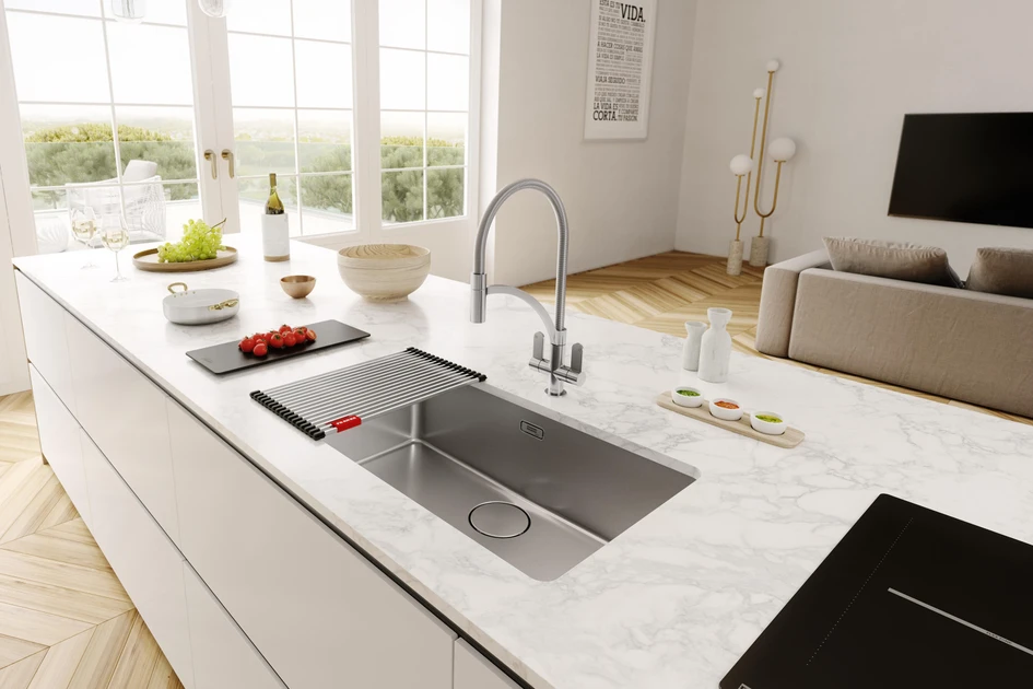 To find the perfect sized kitchen sink, specifiers must think ahead. For those who cook for many, large pans and roasting dishes need wide, deep sinks. Franke Home Solutions’ already-large Urban Sink, for example, pushes its tap mount to one side, giving one half of the bowl extended depth and lengthening its corner-to-corner measurement to over 800cm.Under-mount sinks allow a luxurious worktop’s fine finish and edging to draw the line