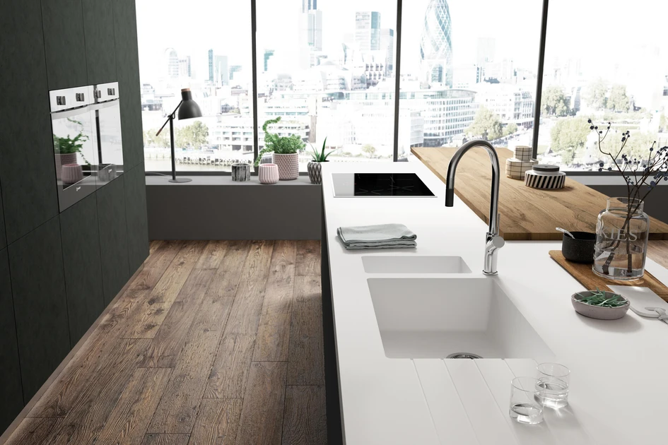 Draining boards are useful to allow washed items a place to sit while waiting to be dried – or to be left to air dry. Schock’s Signus range, for example, features a draining board with a patented tray and overflow to catch and direct wastewater away from clean water in the bowl. Specifiers of luxury worktops, meanwhile, are often keen to keep as much of them on display as possible. In lieu of a sink-integrated draining board, worktops with solid surfaces like HIMACS can be routed to allow for drainage. And for those who don’t like getting their hands wet either, Dornbracht’s kitchen sinks are available with a Touch Flow drain, featuring push-button operation at the top of the sink.
